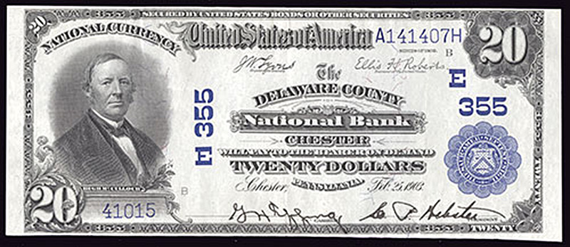 PA. Chester. Ch.E355. Delaware County National Bank. $20. 1902 PB. Fr. 650. No.41015/A141407H. Plate B. EF-AU.