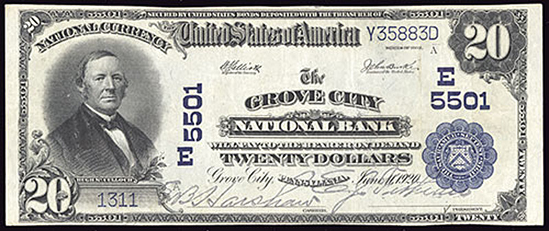 PA. Grove City. Ch.E5501. Grove City National Bank. $20. 1902 PB. Fr. 659. No.1311/Y35883D. Plate A. VF.