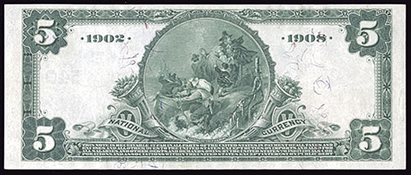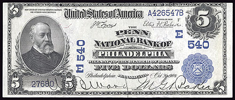 PA. Philadelphia. Ch.E540. Penn National Bank of Philadelphia. $5. 1902 DB. Fr. 590. No.27680/A426547B. Plate F. Uncirculated, with light teller handling.