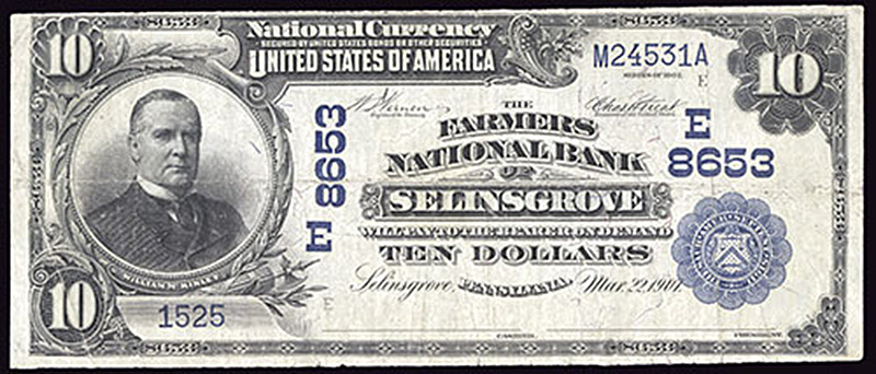 PA. Selinsgrove. Ch.E8653. Farmers National Bank of Selinsgrove. $10. 1902 DB. Fr. 618. No.1525/M24531A. Plate E. Fine, but the signatures are both faded away.