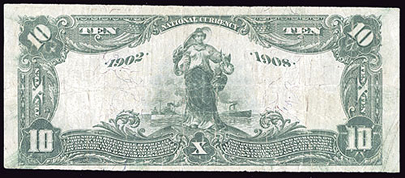 Only seven large size notes were known on the entire bank, and this is the only known Date Back $10. Acquired in 1962.