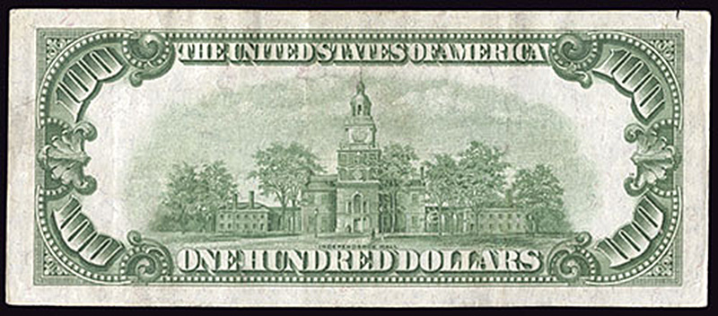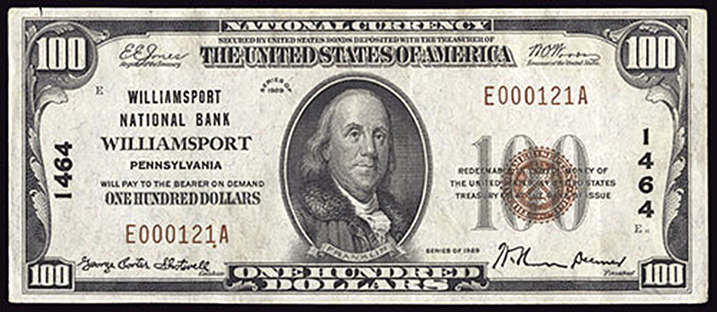 PA. Williamsport. Ch.1464. Williamsport National Bank. $100. 1929 T1. Fr. 1804-1. No.E000121A. Plate E. EF details. There is a tiny edge nick in the upper left margin.