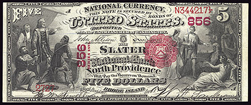 RI. North Providence. Ch.856. Slater National Bank of North Providence. $5. 1875. Fr. 401. No.2727/N344217. Plate A. VF. Trimmed into the top border. Vivid red seal and serial numbers, and nicely penned signatures.