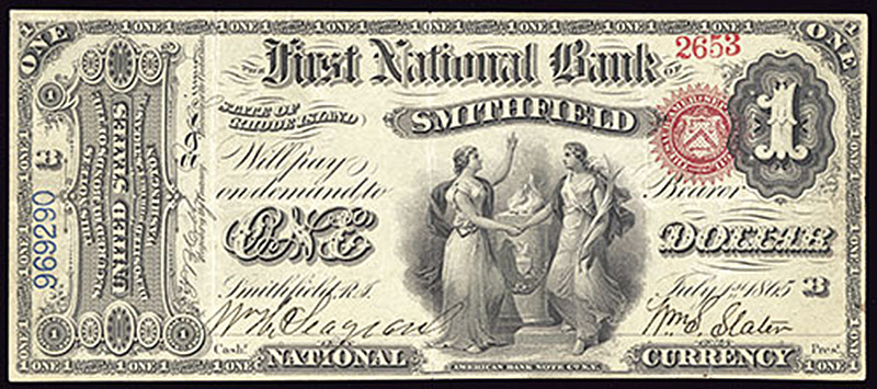 RI. Smithfield-Slaterville. Ch(1035). First National Bank of Smithfield. $1. 1865 Original Series. Fr. 380. Blue serial numbers. No.2653/969290. Plate B. VF-EF, with a small edge split at the top. This note looks as if it was Almost Uncirculated at first glance. Excellent color, nice margins all around, and the signatures are bold and sharp.
