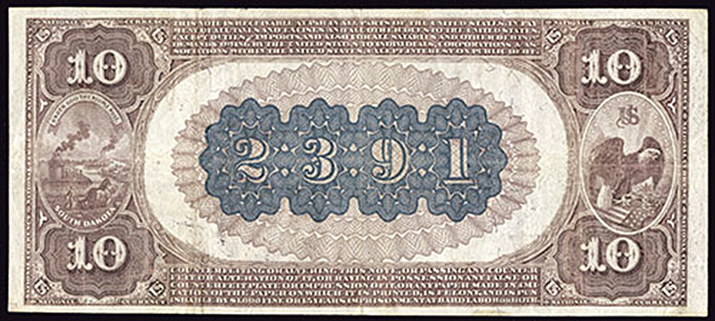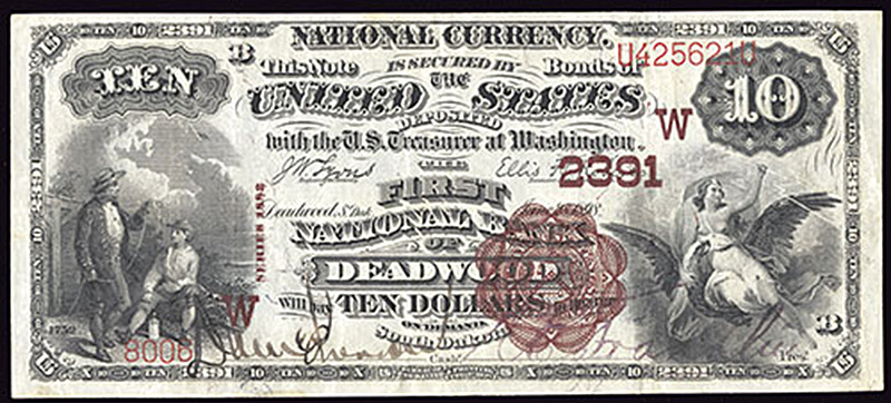 SD. Deadwood. Ch.W2391. First National Bank of Deadwood. $10. 1882 BB. Fr. 490. No.8006/U425621U. Plate B. VF. Choice for the grade, with generous margins all around, near perfect centering front and back, vivid colors, and nice manuscript signatures.