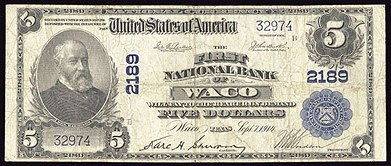 TX. Waco. Ch.2189. First National Bank of Waco. $5. 1902 PB. Fr. 605. No.32974. Plate B. Fine.