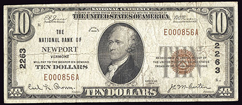 VT. Newport. Ch.2263. National Bank of Newport. $10. 1929 T1. Fr. 1801-1. No.E000856A. Plate K. Fine. Only the eighth small size reported on this bank.