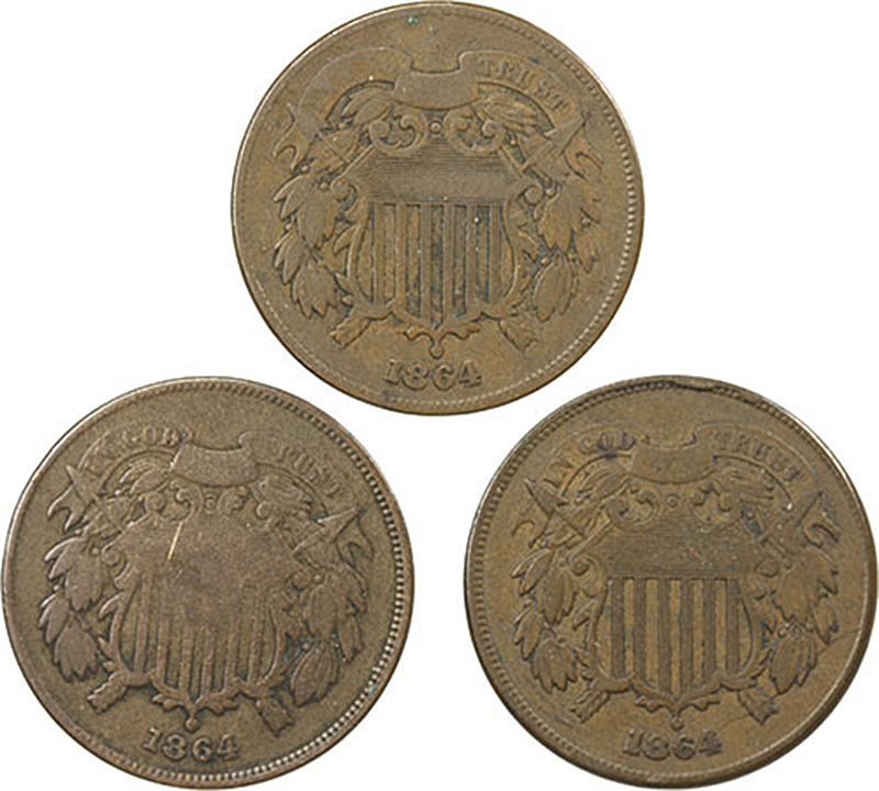 1864 Two Cent Pieces. Good; VG; Fine. [3]