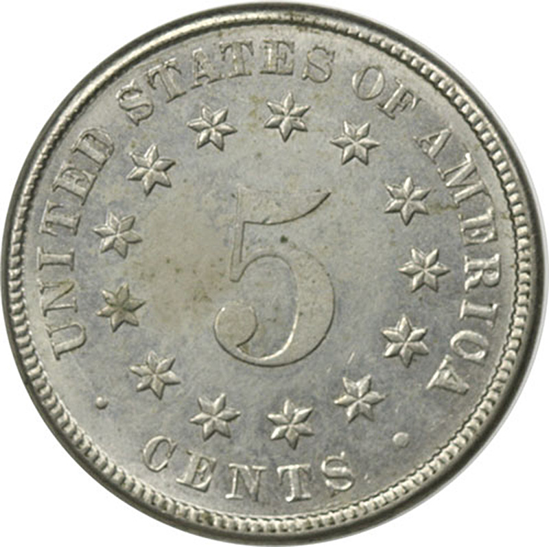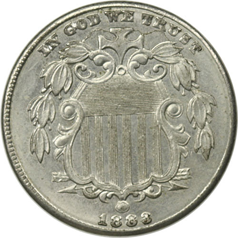 1883 Shield Nickel. Brilliant Uncirculated. Satiny white luster surfaces with some light cloudy toning on the reverse.