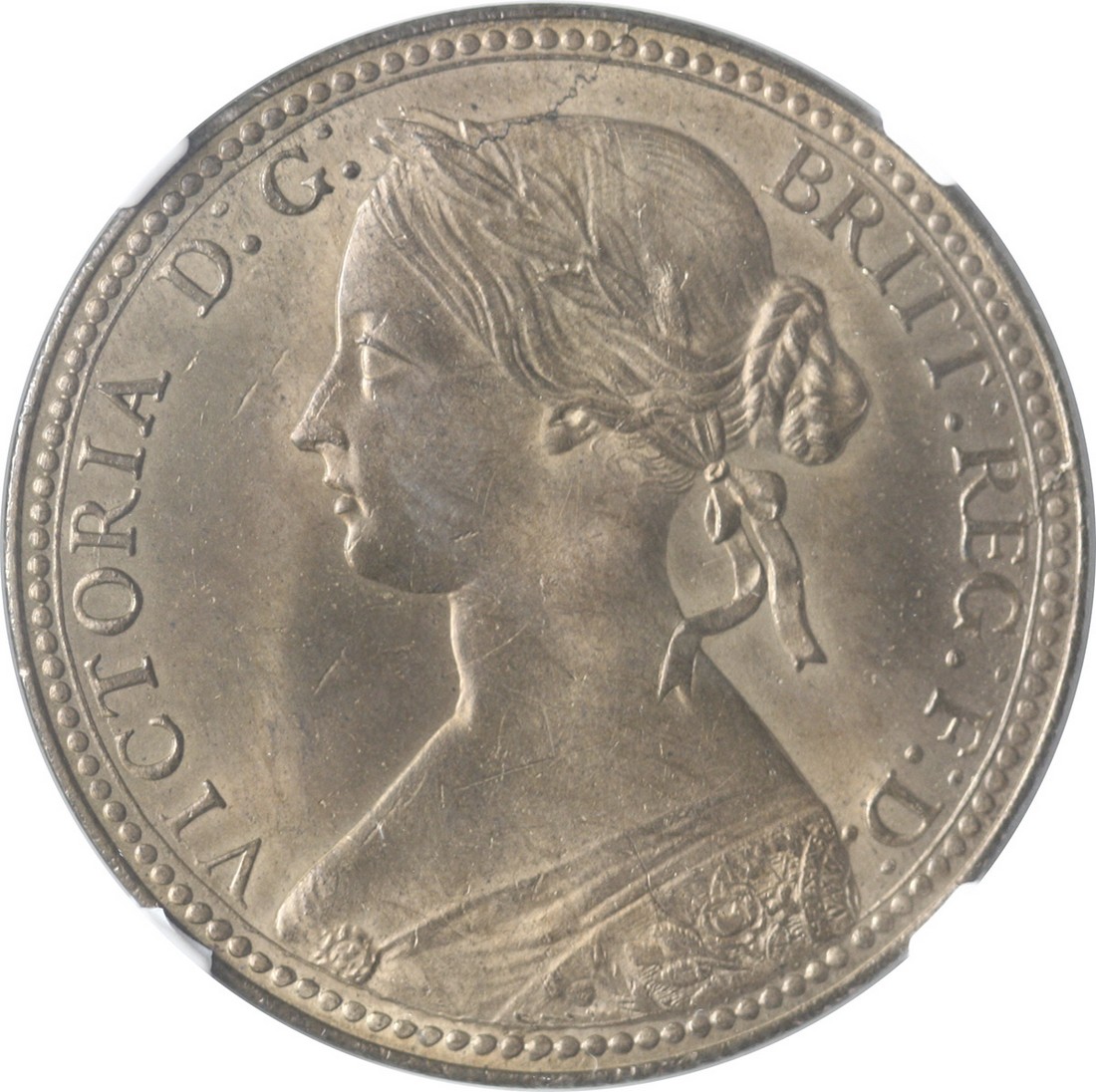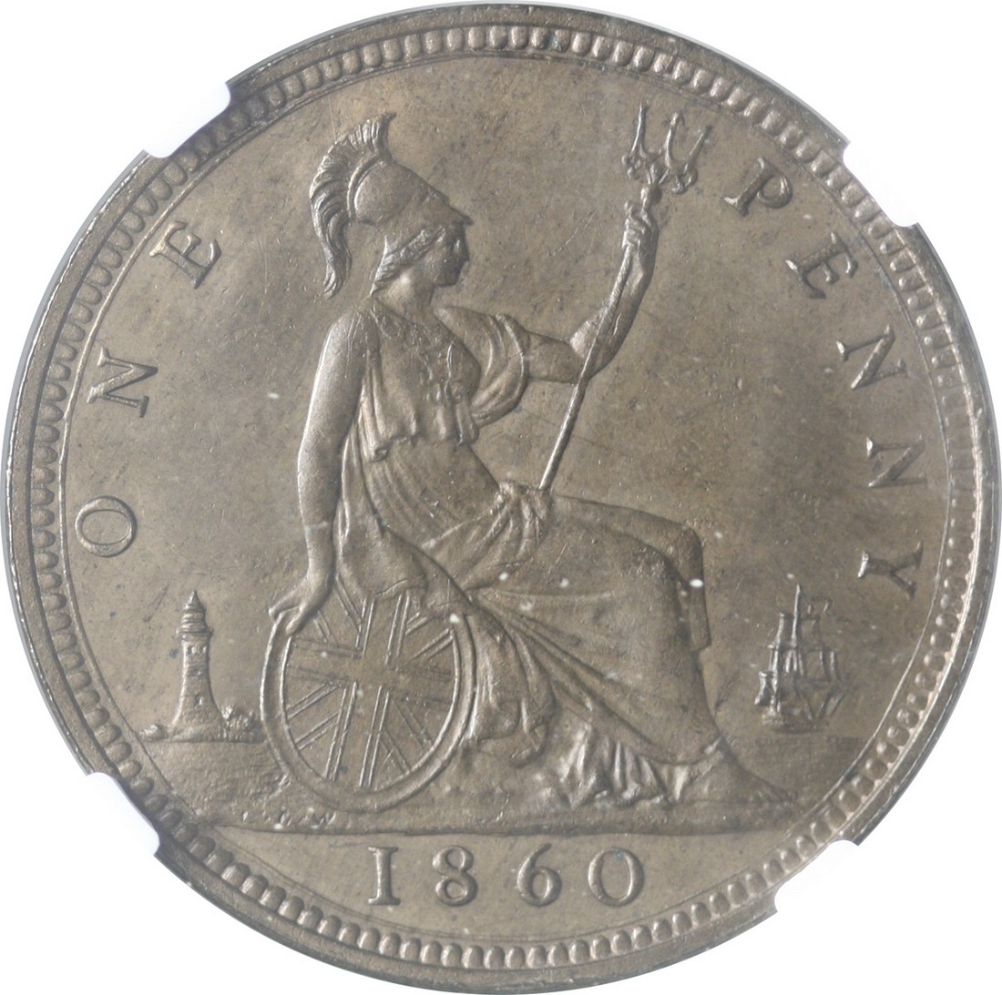 Great Britain. Victoria (1837-1901). Penny, 1860. Beaded border obverse, toothed border reverse. Young bust l., rev. Britannia seated r. Freeman 8 (R18), S.3954, KM 749.2. Very Rare. Characteristic thin diebreak at top. NGC MS 64 RB.