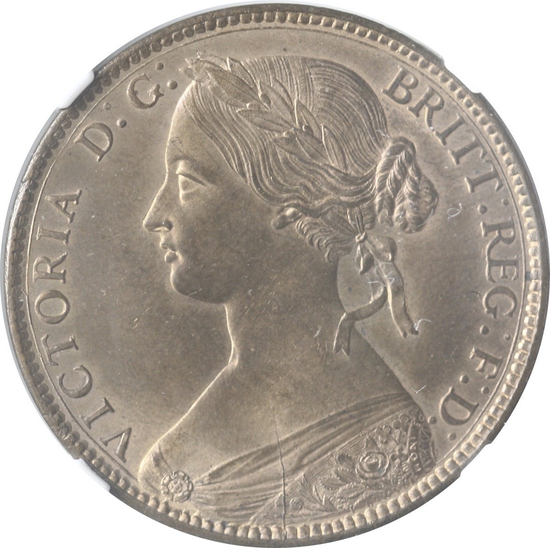 Great Britain. Victoria (1837-1901). Penny, 1860. Toothed borders, LCW below foot. Young bust l., rev. Britannia seated r. Freeman 14 (R15), S.3954, KM 749.2. Thin obverse diebreak. Bold strike with pleasing lustre. NGC MS 65 RB.