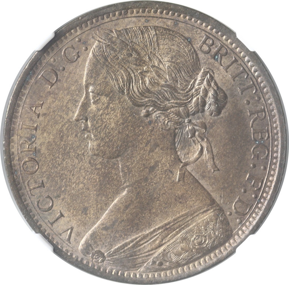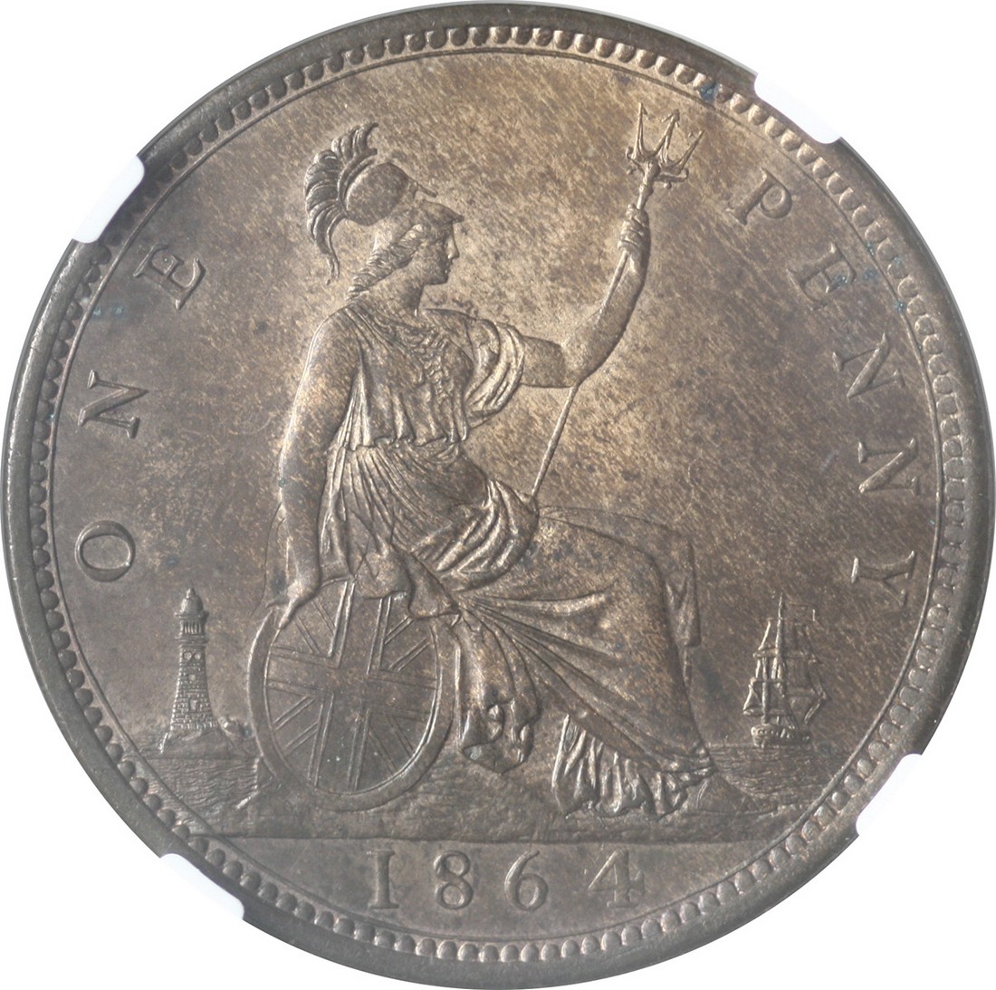 Great Britain. Victoria (1837-1901). Penny, 1864. Crosslet '4'. Young bust l., rev. Britannia seated r. Freeman 48, S.3954, KM 749.2. Rare. NGC MS 63 RB.