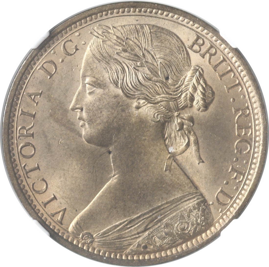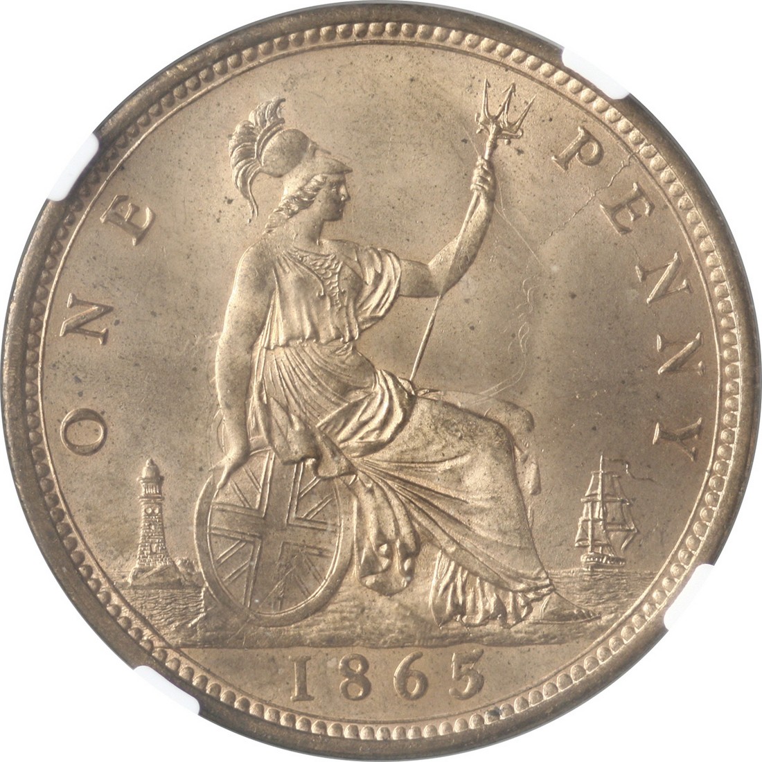 Great Britain. Victoria (1837-1901). Penny, 1865/3. Young bust l., rev. Britannia seated r. Freeman 51 (R13), S.3954, KM 749.2. Boldly detailed example with abundant mint red and pleasing lustre. NGC MS 65 RB.