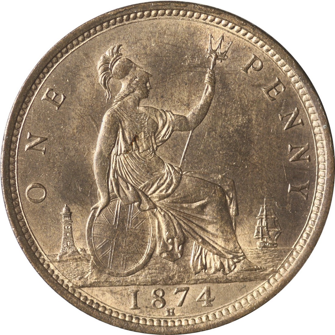 Great Britain. Victoria (1837-1901). Penny, 1874 H. Heaton. Aged bust, open ribbons obverse, reverse of '73. More mature bust l., rev. Britannia seated r. Freeman 71 (R9), S.3955, KM 755. Ample mint red, bold details. Choice Brilliant Uncirculated.