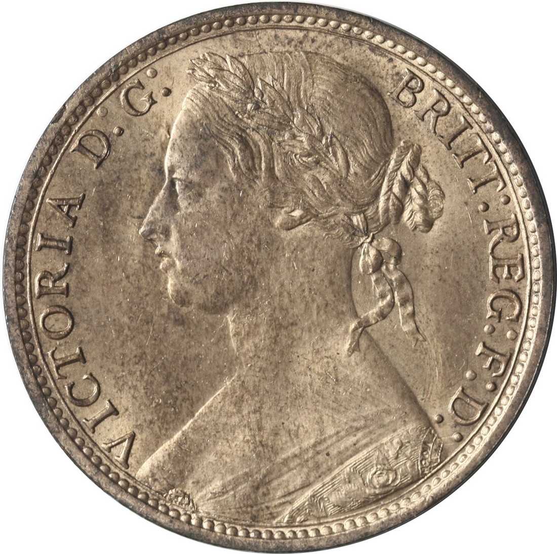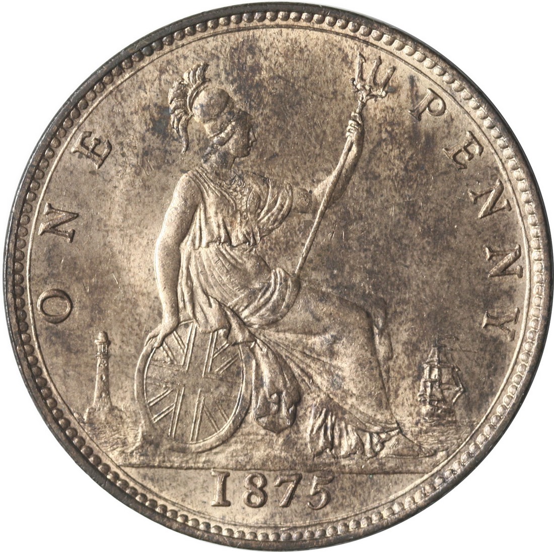 Great Britain. Victoria (1837-1901). Penny, 1875. Small, narrow date. More mature bust l., rev. Britannia seated r. Freeman 80, S.3954, KM 755. Decent amount of mint red. Brilliant Uncirculated.