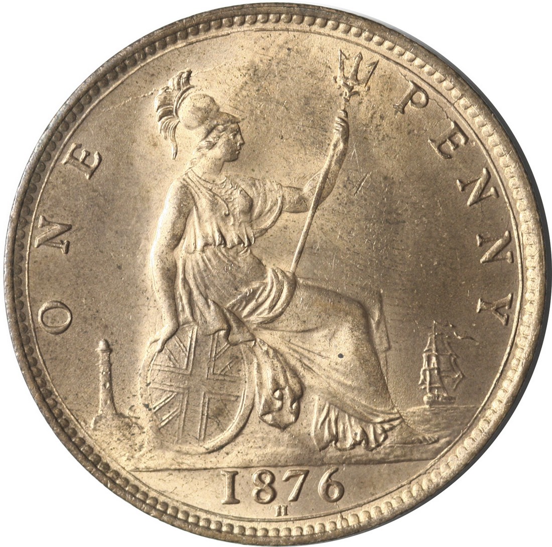 Great Britain. Victoria (1837-1901). Penny, 1876 H. Heaton. Small, narrow date. Mature bust l., rev. Britannia seated r. Freeman 89, S.3955, KM 755. Good amounts of mint red. Choice Brilliant Uncirculated.