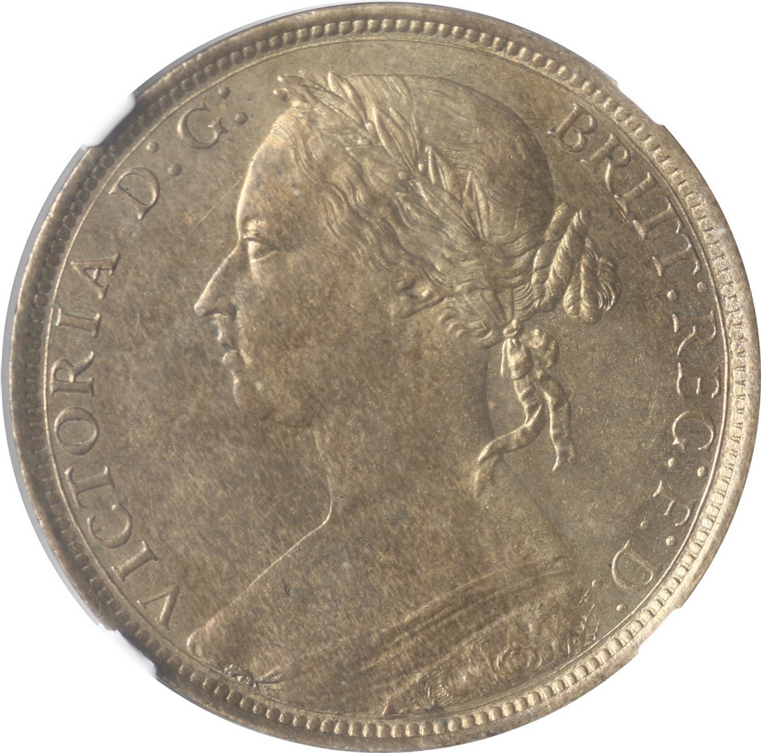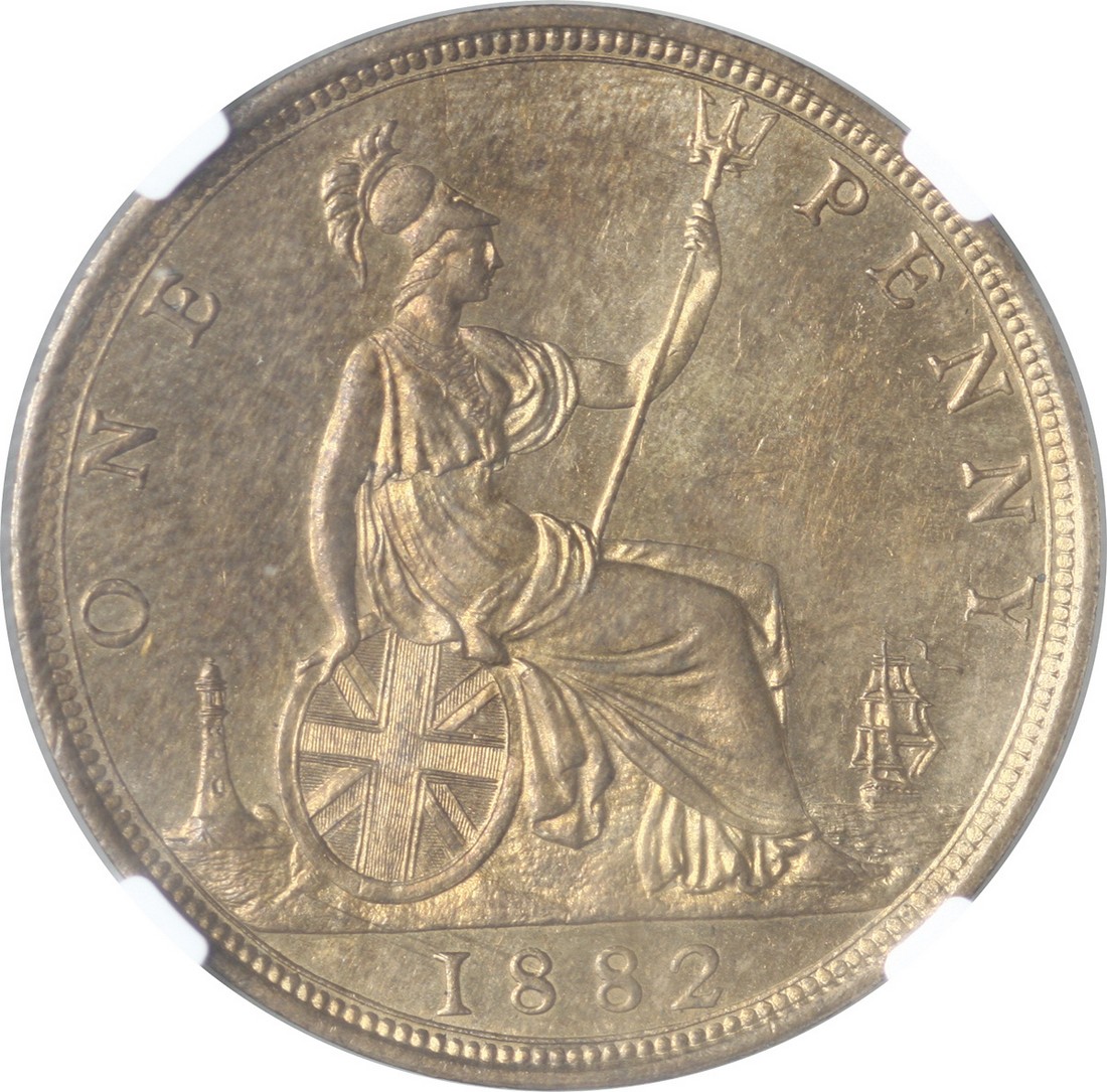 Great Britain. Victoria (1837-1901). Penny, 1882. Mature bust l., rev. Britannia seated r. Freeman 112 (R17), S.3955, KM 755. Crisp details, abundant mint red. One of, if not, the finest known examples of this Very Rare date. NGC MS 64 RB.