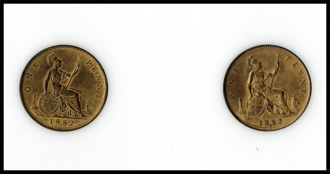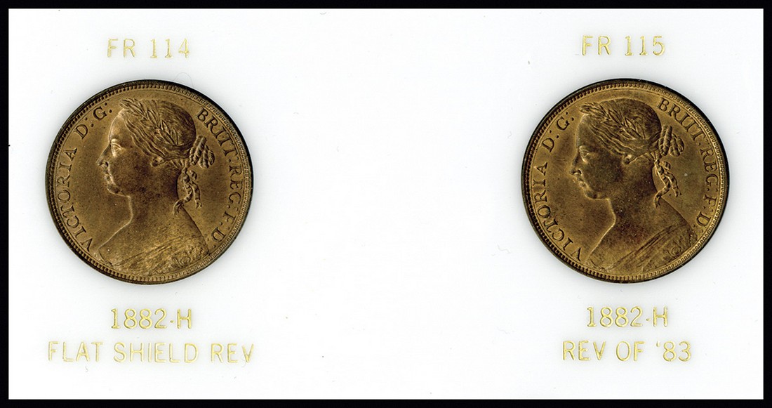 Great Britain. Victoria (1837-1901). Variety pair of 1882-H Pennies. Flat shield reverse, and reverse of '83 (Reverse `N'). Mature bust l., rev. Britannia seated r. Freeman 114 and 115, S.3955, KM 755. Housed in a custom Victorian Penny "1880-1883 Varieties" frame, white with gold lettering. Brilliant Uncirculated. (2)