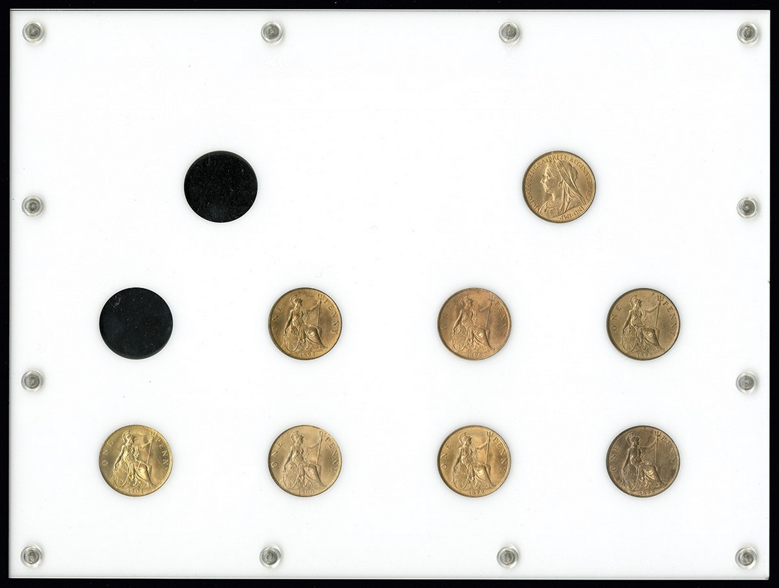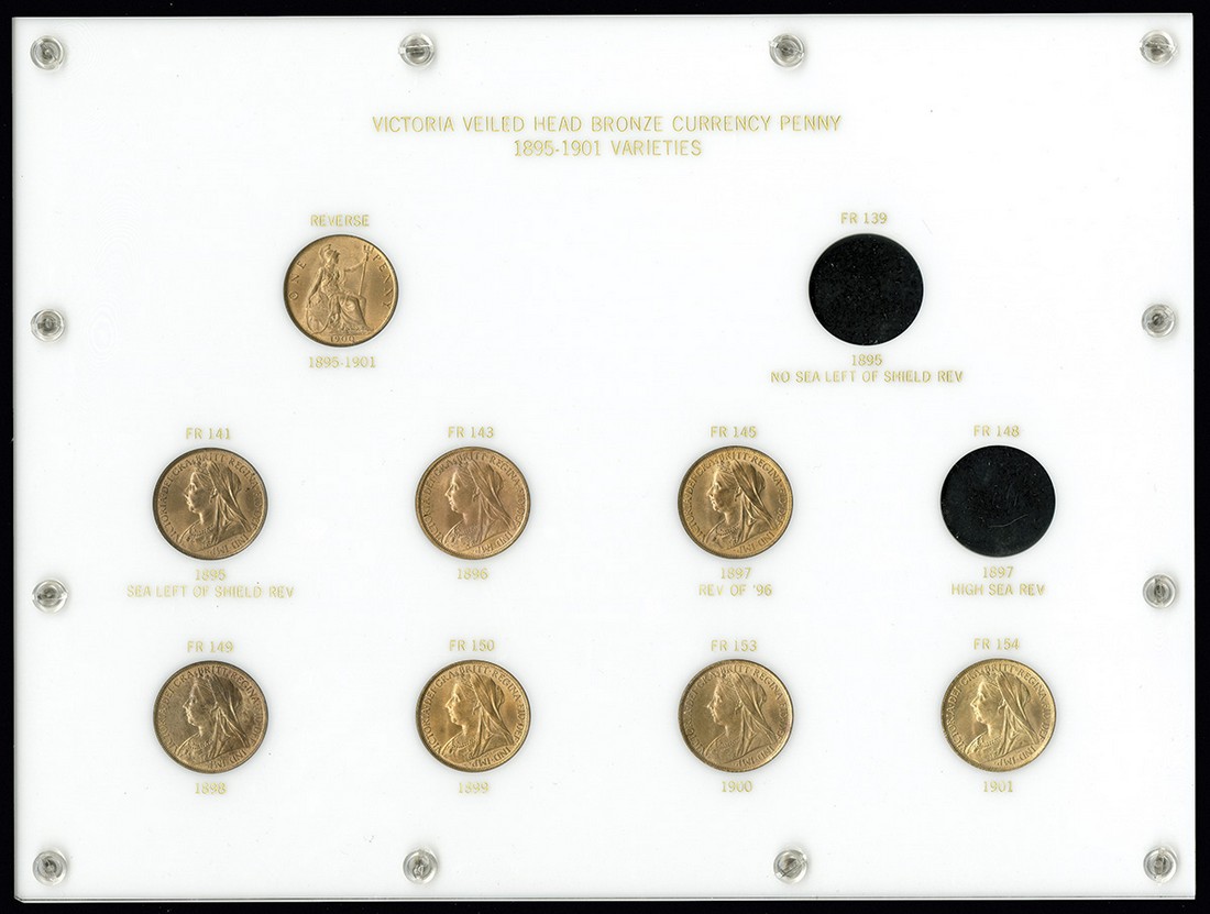 Great Britain. Victoria (1837-1901). Date run of "Old head" Pennies, 1895-1901. The 1897 is normal sea level. Extra 1900 Penny, showing reverse. Freeman 139, 141, 143, 145, 149, 150, 153, 154; S.3961, KM 790. Housed in a custom frame, white with gold lettering. Choice Brilliant Uncirculated to Very Choice Brilliant Uncirculated. (8).