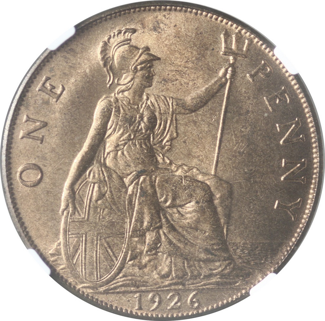 Great Britain. George V (1910-1936). Penny, 1926. Modified effigy. S.4054, KM 826. Nearly full mint red, superb and one of the finest examples of this rare coin. NGC MS 65 RB.