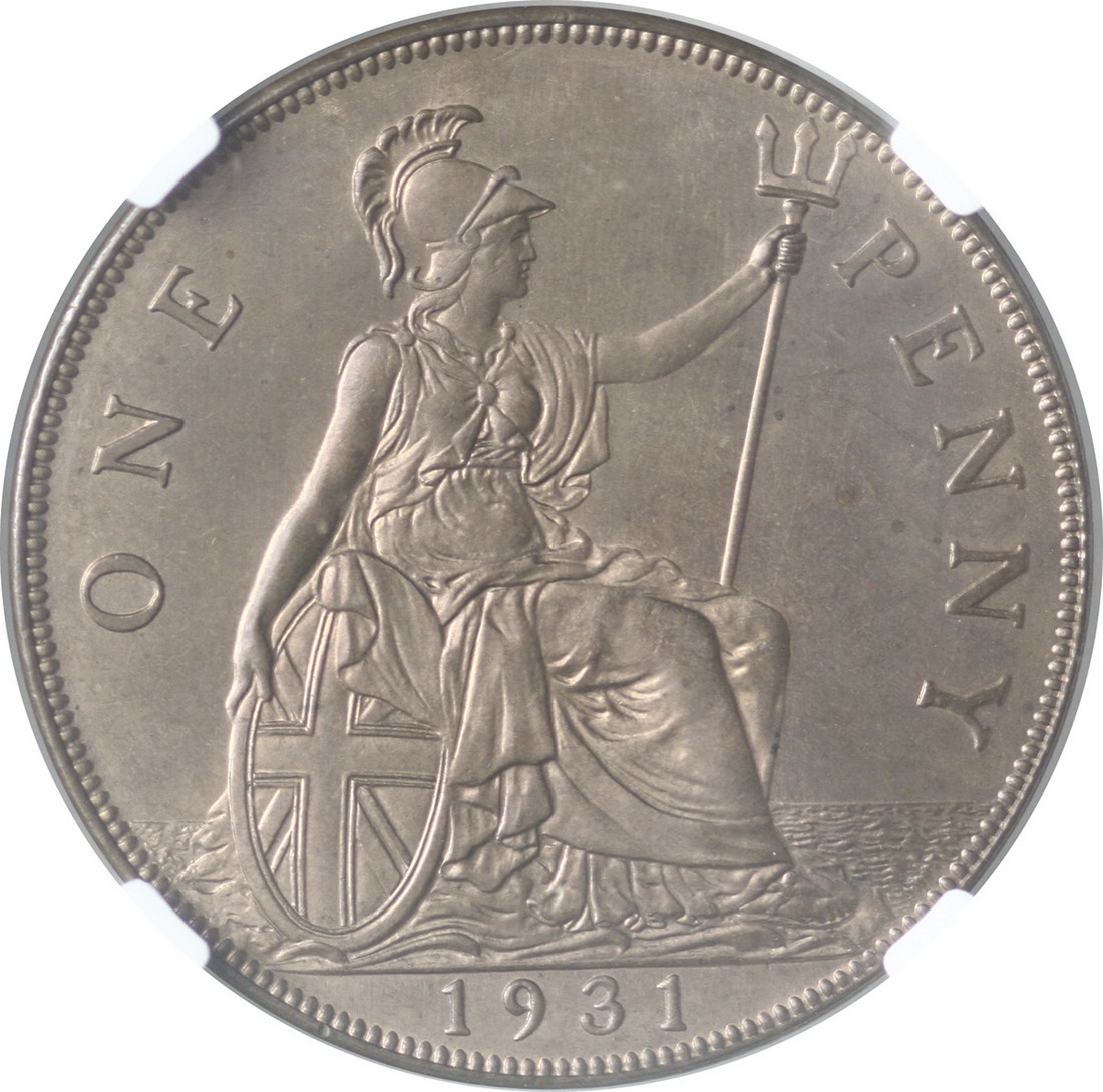 Great Britain. George V (1910-1936). Proof Penny, 1931. Small head l. S.4055, KM 838. Very Rare. A superlative example, nearly full mint red. NGC PG 65 RB.