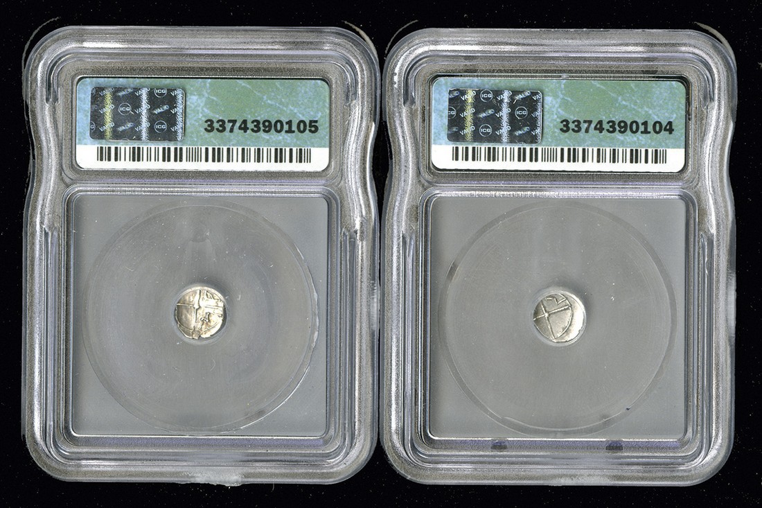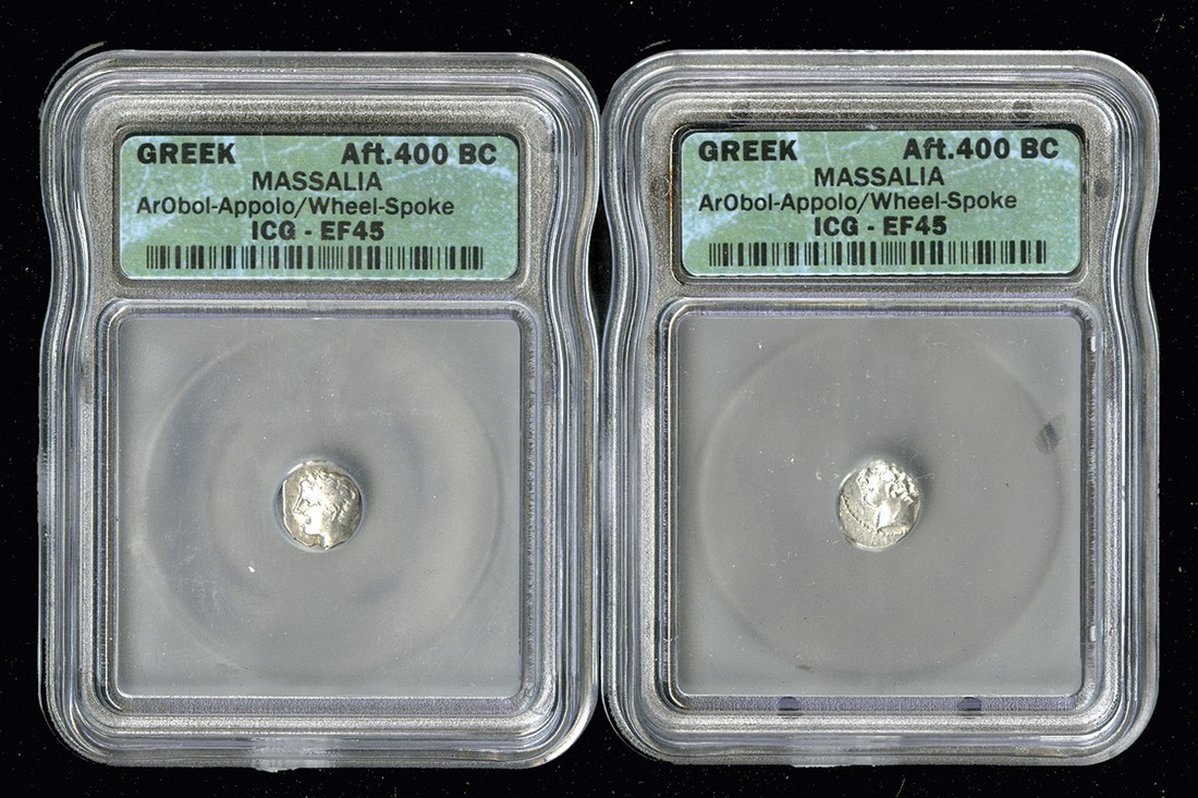 Gaul. Massalia. Pair of encapsulated AR Obols, ca. 350-215 BC. Young male head l., rev. M-A, four-spoke wheel. Depeyrot 10, SNG Copenhagen 723ff. Very Fine and Extremely Fine, the latter obverse off center, losing top of head. Both ICG EF 45. (2)