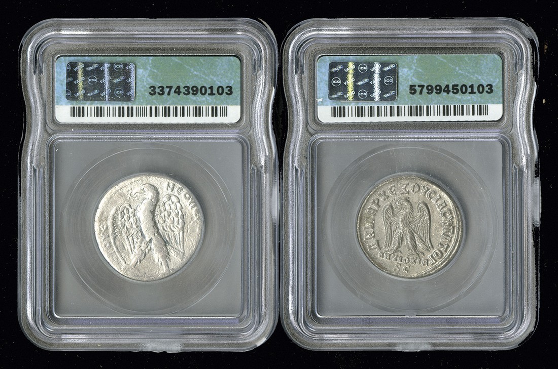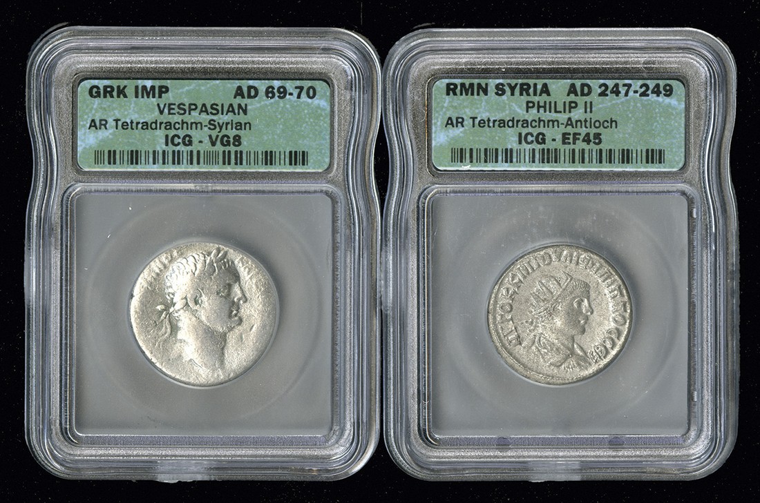 Roman Syria. Pair of encapsulated AR Tetradrachms of Antioch: Vespasian (69-79). Laureate head r., rev. Eagle standing l. Cf.Prieur 124. Only snippets of legend, some porosity. Fine. ICG VG 8; Philip II (247-249). Issue of 248. Radiant bust r., rev. Eagle standing l. Prieur 413. Dappled toning. Good Extremely Fine. ICG EF 45. (2)