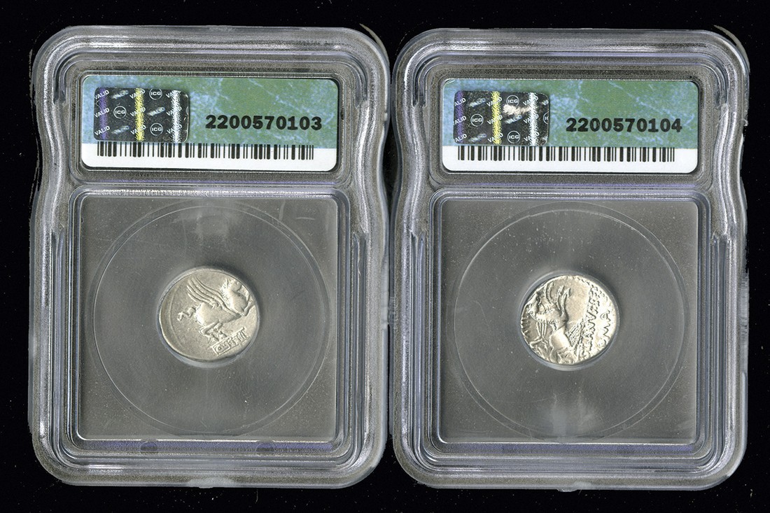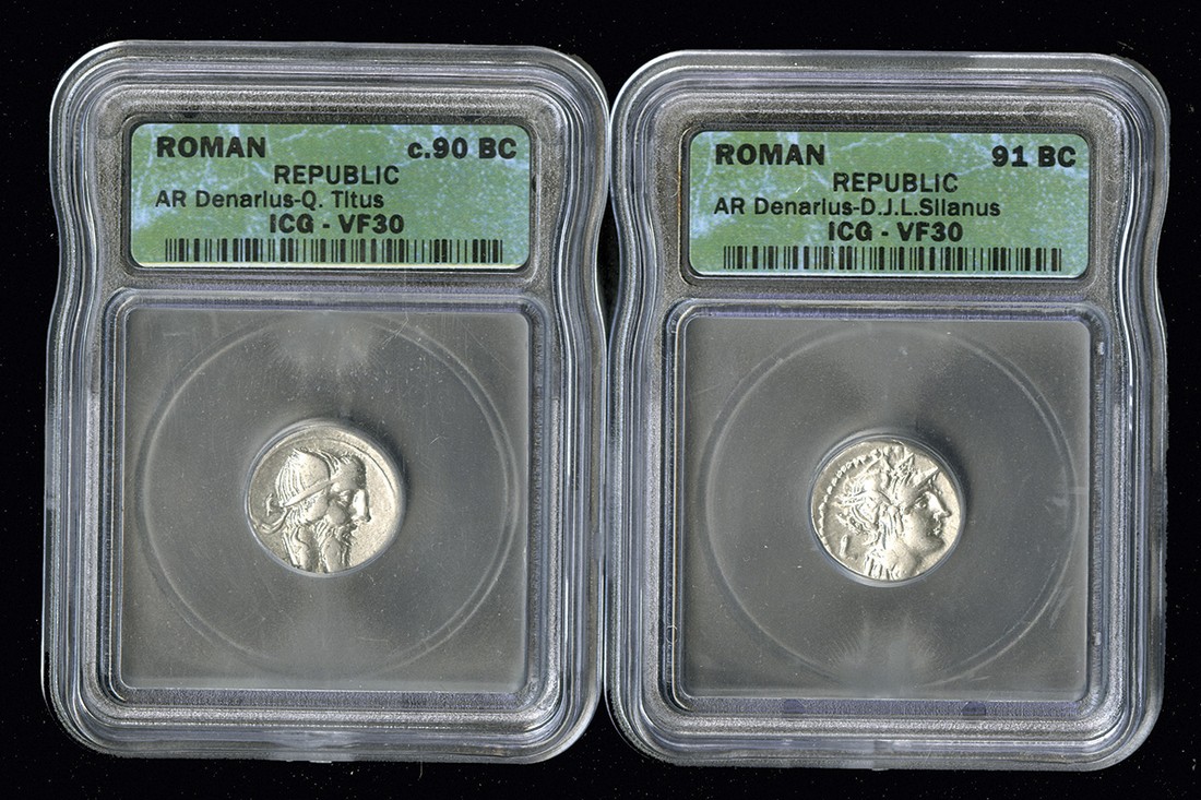 Roman Republic. Pair of encapsulated AR Denarii: D. Silanus L.f. 91 BC. Roma head r. wearing winged helmet, 'L' behind, rev. Victory driving biga r., control number above. Craw.337/3; Q. Titius. 90 BC. Head of Mutinus Titinus r., rev. Pegasos r. Craw.341/1. Reverses somewhat off-center, but overall good strikes with pleasing details. Very Fine. ICG VF 30. (2)