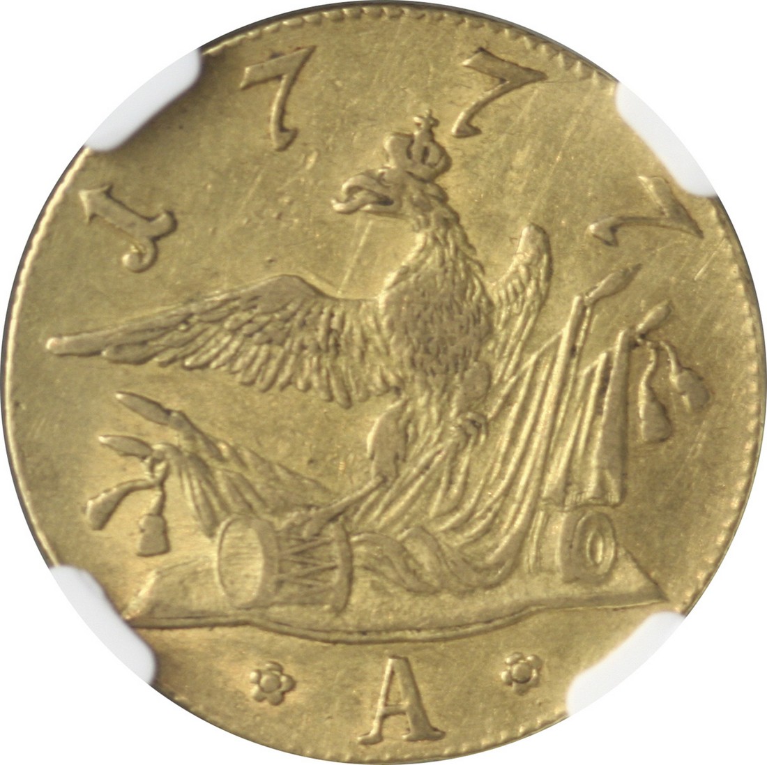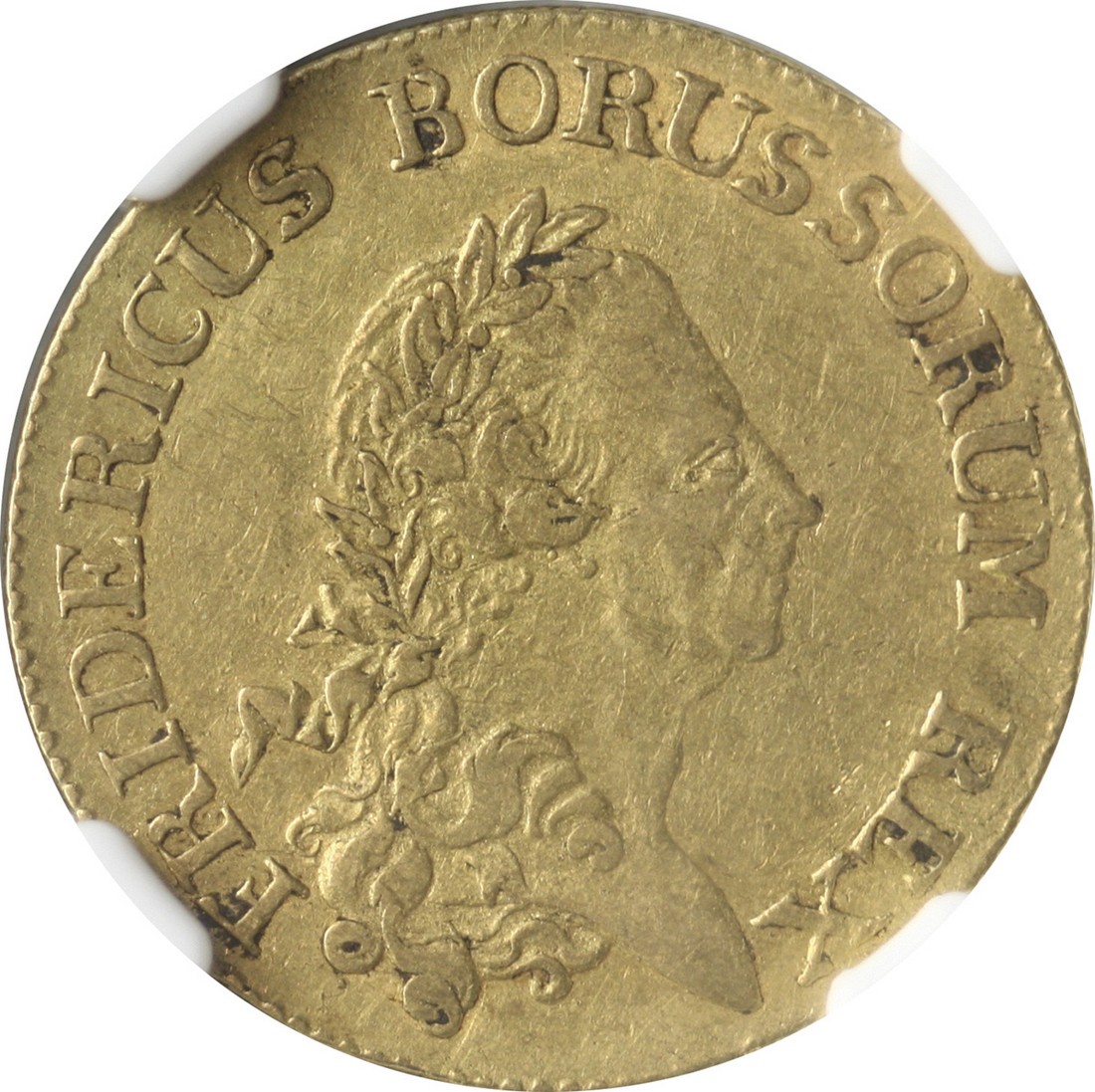 German States. Prussia. Friedrich II, the Great (1740-1786). Frederick d'or, 1777 A. Laureate head r., rev. Crowned Prussian eagle, head l., standing atop trophy of arms and banner. Fr.2411, KM 333. NGC XF 45.