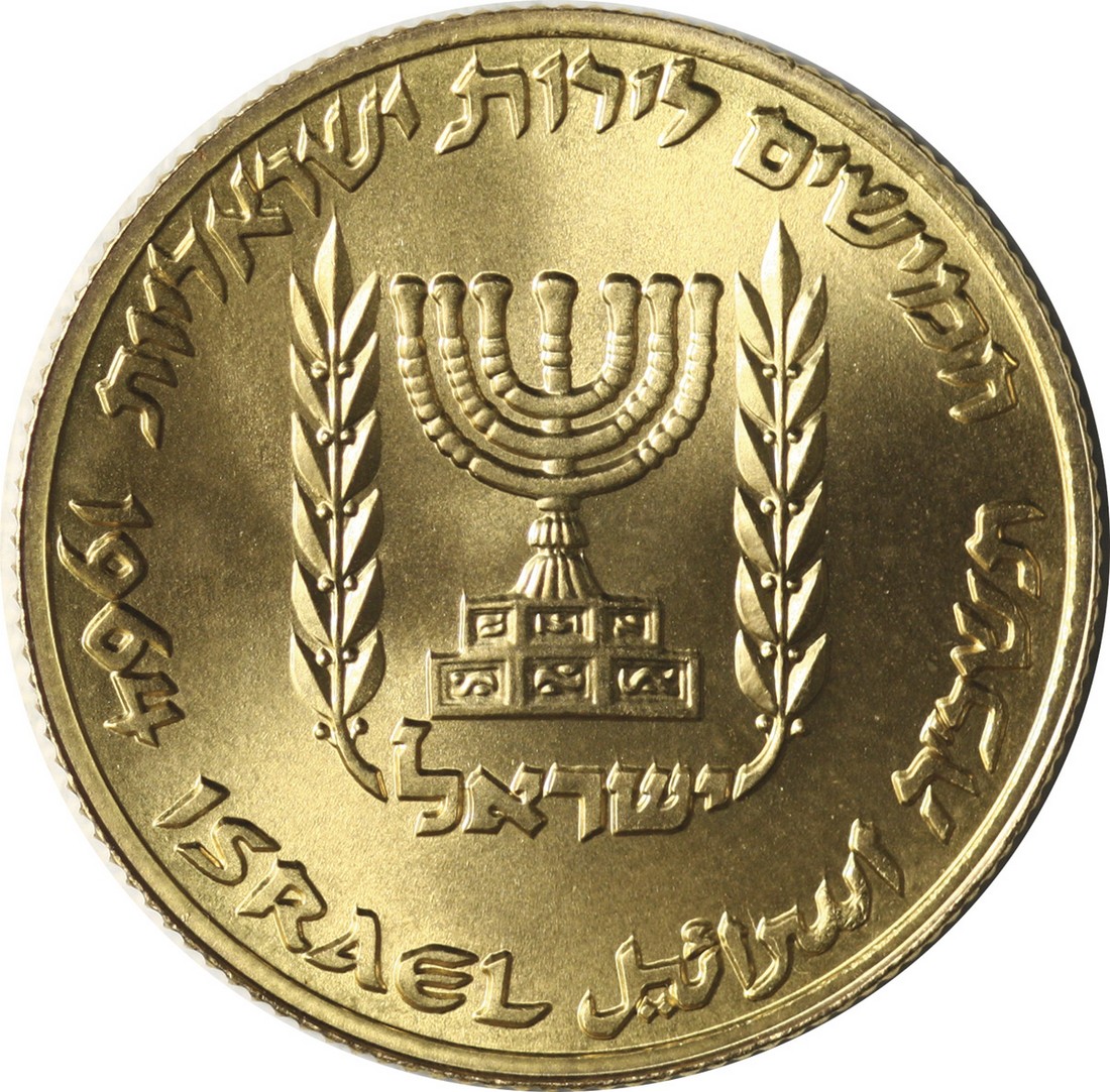 Israel. 50 Lirot, JE 5725 /1964. 10th Anniversary of the Bank of Israel. Menorah flanked by sprigs within circle, rev. Hebrew legend lower left, double cornucopiae design upper right. KM 44. With original white slipcase. Brilliant Uncirculated.