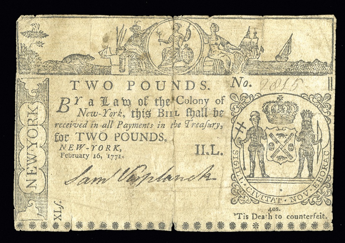 New York. February 16, 1771. Two Pounds. Fr. NY-164. No. 2015. Type c. Stars have 12 points except 7th from right. Verplanck. VF detail. Light age toning. Small internal splits, and pinholes.