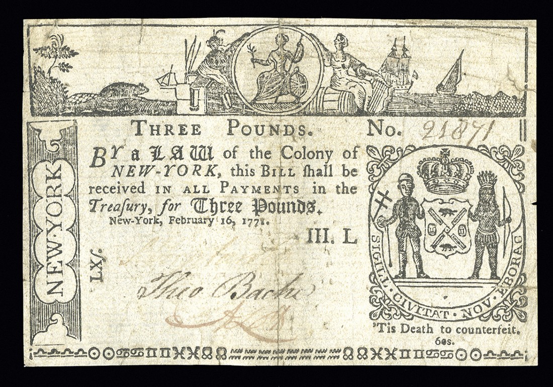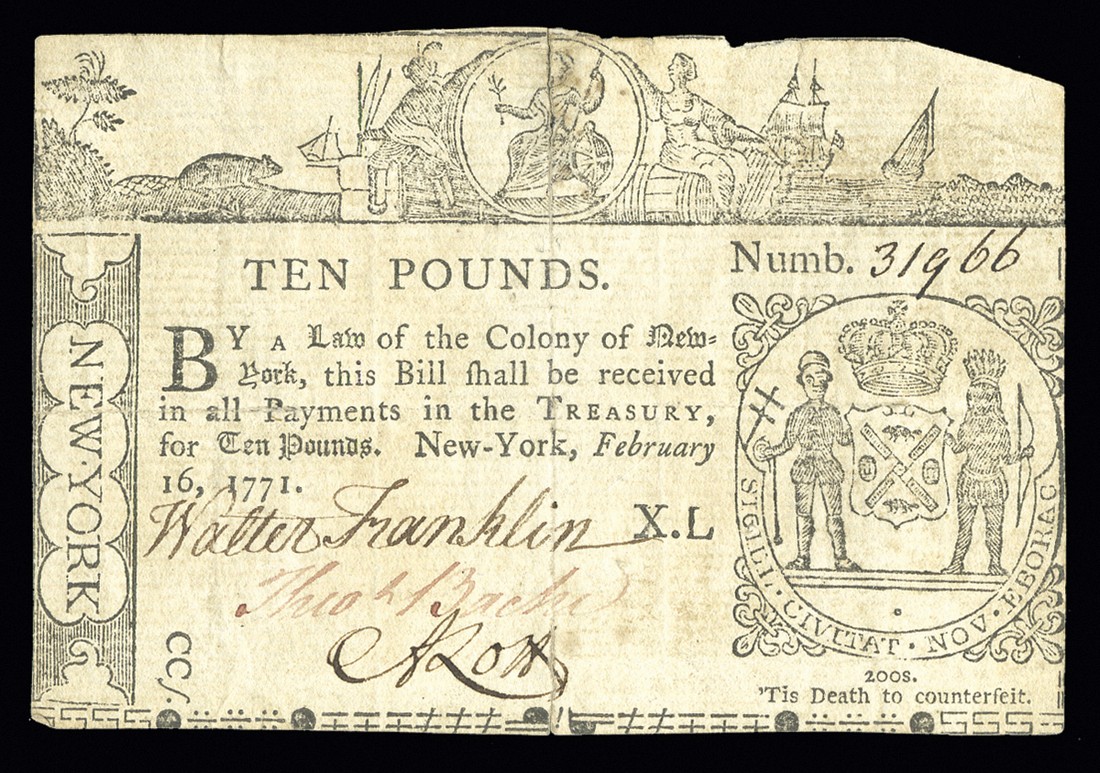 New York. February 16, 1771. Fr. NY-165 and 167. 1) Three Pounds. Appearance of VF-EF, but split in half and repaired. 2) Ten Pounds. Mounting remnants, repairs, uneven top border, otherwise VF. [2].