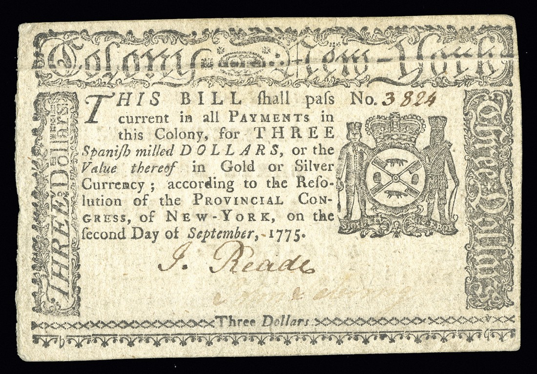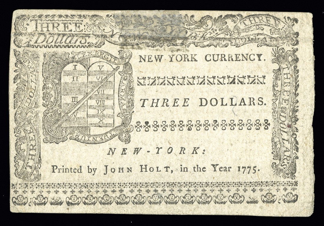 New York. September 2, 1775. $3. Fr. NY-179. No. 3824. Colonial arms. Ten Commandments. Signed by Reade and Sebring. Almost Uncirculated. A horizontal paper wrinkle extends across the top, as made. There is a tape mounting remnant on the back. Full margins, front and back.