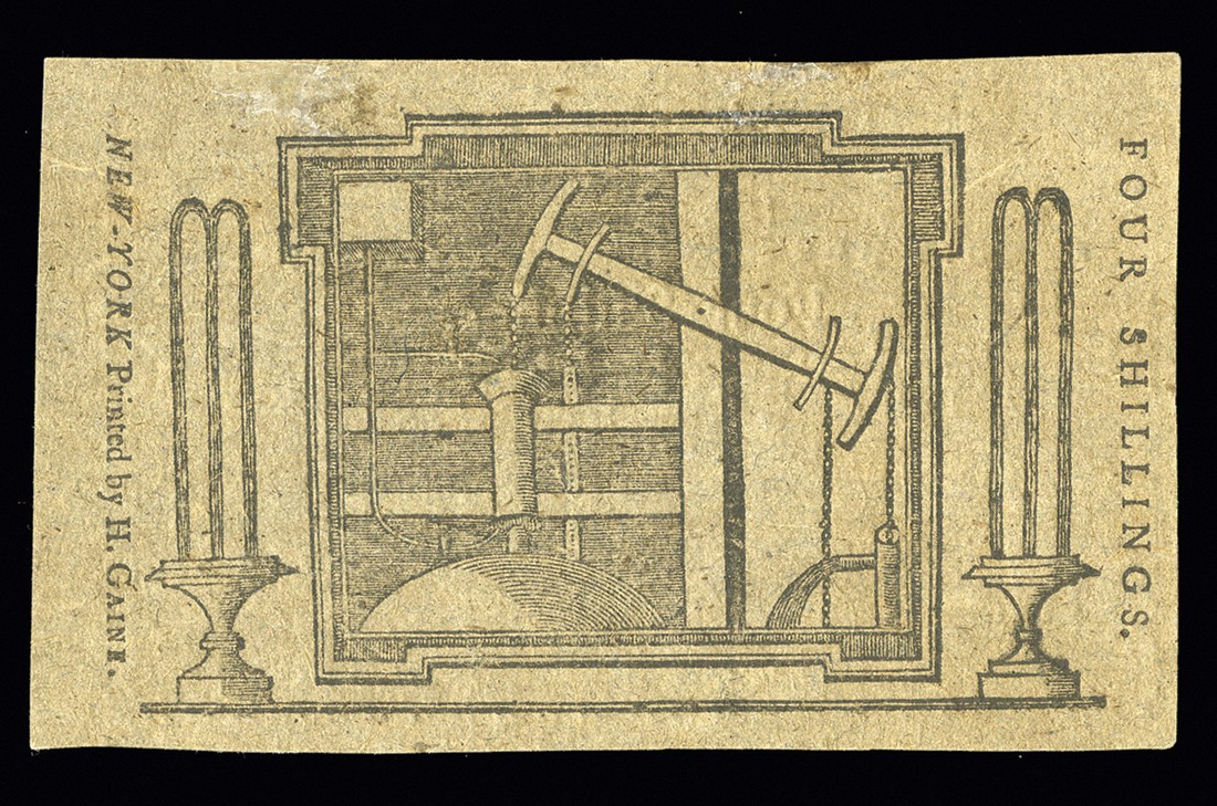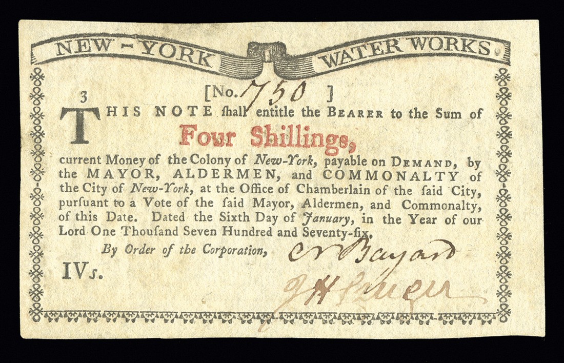 New York. January 6, 1776. 4 Shillings. Fr. NY-183. No. 750. Red and black. Third issue of water works notes. Signed by Bayard and Cruger. Uncirculated. Would be Choice except for some stamp hinge mounting remnants.