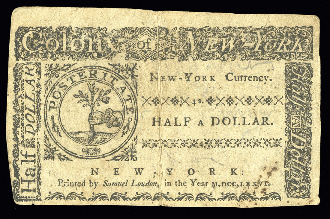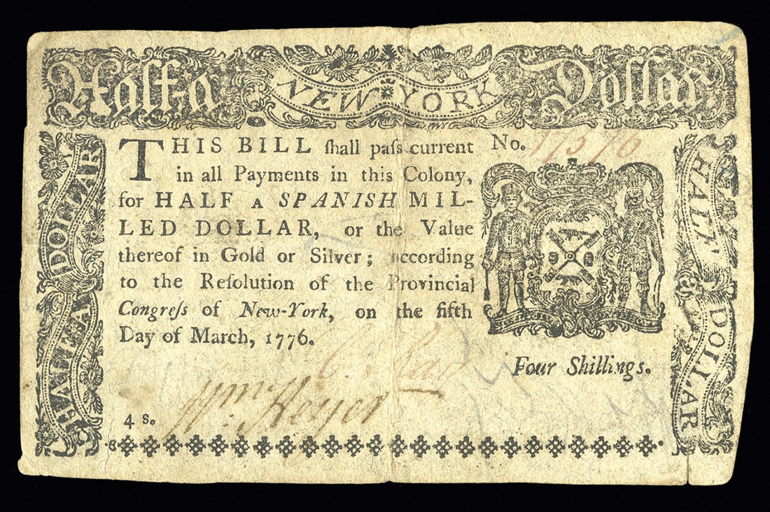 New York. March 5, 1776. $1/2. Fr. NY-189. No. 17576. Colonial arms. Planting a tree. Signed by Ray and Heyer. EF. There is a short split in the margin at lower right, and a minor stain on the back, not distracting. Overall quite appealing.