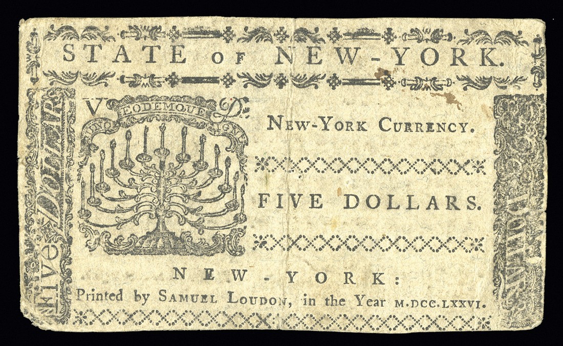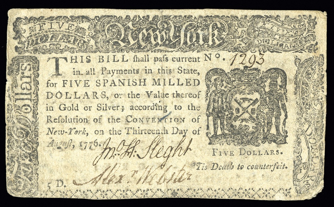 New York. August 13, 1776. $5. Fr. NY-204. No. 1293. Colonial arms. Candelabra. Signed by Sleght and Webster. VF-EF. Two pinholes, and the corners are rounded.