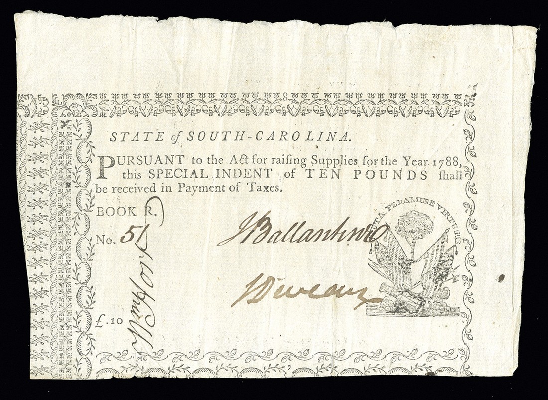 South Carolina. 1788. 10 Pounds. Fr. SC-185. "TUTA PEDAMINE VIRTUTUS" (HONOR SAFE IN ITS SUPPORT) appears in an arch above palm tree, flags, and cannons. The text reads "PURSUANT to the Act for raising Supplies for the Year 1788, this SPECIAL INDENT of TEN POUNDS shall be received in Payment of Taxes." Signed by James Ballentine and John Devaux at right, and countersigned by William Hork, at left. Ornate indent and top and bottom borders.