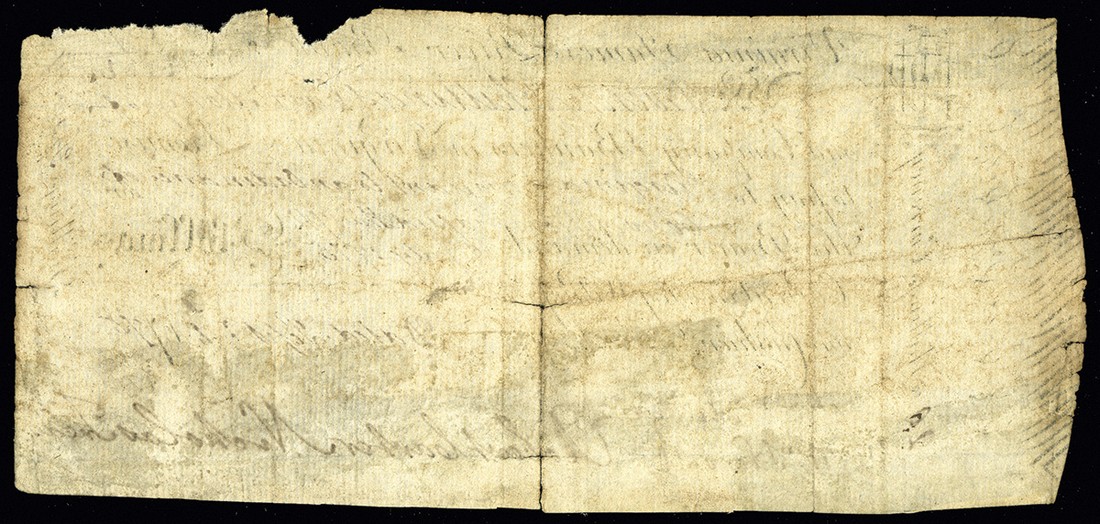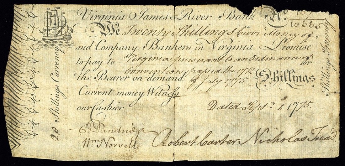 Virginia. September 1, 1775 James River Bank Form. 20 Shillings. Fr.VA-82. No.107/10665. Sailing ship. Engraved indent. Engraved lines for fill in are very light. B. Dandridge, Robert Carter Nicholas and William Norvell. These were printed on excess forms left over from the April 1, 1773 emission. Fine details, with small pieces out at the top right, and there are some minor fold splits.