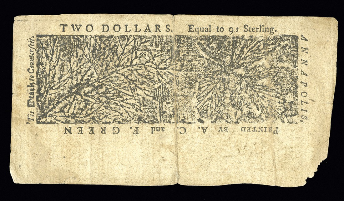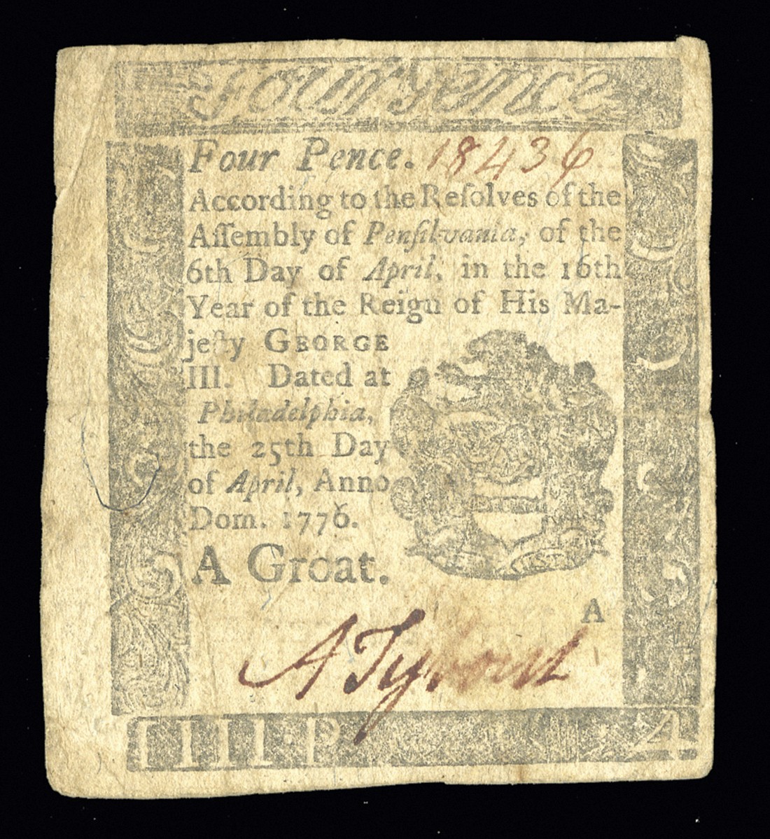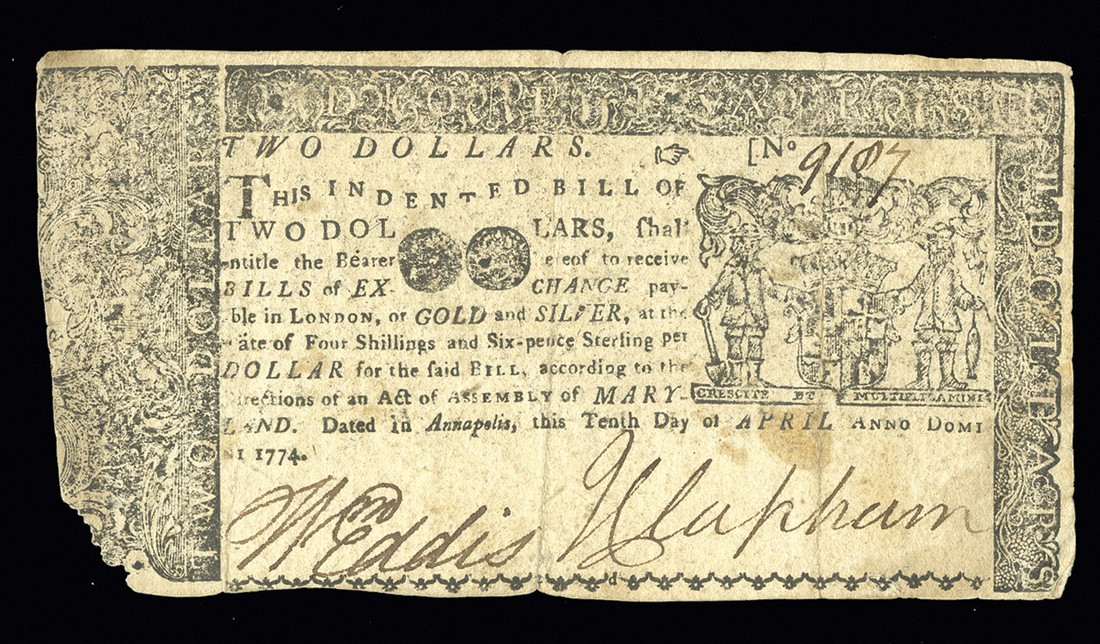 Colonial Duo. 1) Maryland. April 10, 1774. $2. Fr. MD-67. VF details. Corner missing. 2) Pennsylvania. April 25, 1776. 4 Pence. Fr. PA-198. VF, light stains. [2]