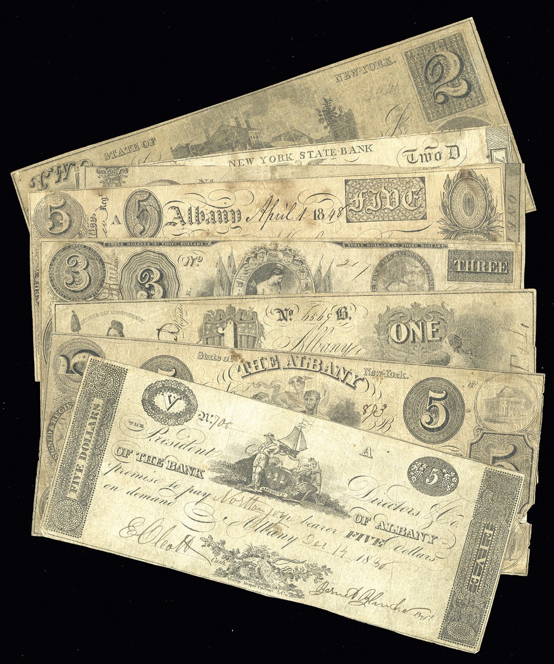 NY. Assortment of Counterfeit and Spurious Notes from Albany. 1) Albany Bank $5 1830 C80a. Fine. 2) Albany City Bank $5 1863. C40b. Fine details, small piece out and repairs. 3) Albany Exchange Bank $1 1847. S5. Fine details, stain. 4) Albany Exchange Bank $3 1859. S15. Fine or so. 5) Canal Bank of Albany $1 1847. C22. Fine, pinholes, graffiti. 6) Mechanics & Farmers Bank $1 1819. C12a. Fine detail, but torn and repaired. 7) Mechanics & Farmers Bank $5 1848. C94. Fine, some age toning. 8) New York State Bank $2 1819. C64. Fine detail, small pieces out. Repairs. 9) Union Bank of Albany $2 1859. C4d. Fine. [9]