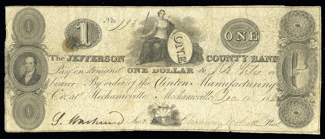 NY. Mechanicville. Clinton Manufacturing on Jefferson County Bank. $1. 1826. (H4). Woman with spear. Clinton, left. Fine. R6.