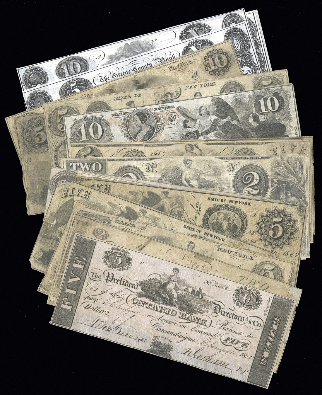 NY. Assortment of New York Counterfeit and Spurious Notes. 1) Bank of Albion $2 1860. C4a. Fine detail, corner repaired. 2) Albion. Bank of Orleans $5 1871 (false fill in). C26a. VF, POC. 3) Alexander. Exchange Bank of Genesee. "BATAVIA." $5 1854. S5. Fine detail, torn, rejoined. 4) Auburn. Cayuga County Bank $1 ND. Perhaps G22a. Red ONE. Good, POC. SENC. 5-6) Bank of Bainbridge $10 1850. C22a. "PENN YAN." VG; VF. 7) Ballston Spa Bank $5 1862. S5a. Fine detail, split and repaired. 8) Bank of Bath $5 1852. C6a. Rare photographic counterfeit. Fine detail, but central stains and ink erosion holes. 9) Central Bank of Brooklyn $5 1859. Three men. Blue 5s. State seal, left. Altered from a Massachusetts note. Not in Haxby. Fine detail, light stains. 10-11) Buffalo City Bank $5 1862. C6. Brown backs. VF detail, repaired tear; Fine detail, corner missing. 12) Buffalo. Bank of Niagara $1 1825. C24. Solid Fine. 13) Buffalo. Bank of Niagara $5 1827. C80. Solid Fine. 14) Buffalo. Bank of Niagara $3 1816. C56. Fair, pieces missing. 15) Canandaigua. Ontario Bank $5 1820. C160. VF. 16-17) New York. Merchants Bank $2 1820s. C22b. Both Fair-AG, one heavily cancelled, and with a hole. 18) Ogdensburgh. Oswegatchie Bank $5 1861. S5. VG. 19) Bank of Rochester $5 ND. C8 (not in Haxby). Good, some internal splits. 20) West Windfield Bank $5 1861. C6c. VG. 21) West Winfield Bank $10 ND. C8b. Fine detail, torn, repaired. 22-25) Reprints of Tradesmen's Bank (Catskill) $1,2,5,10. Unc.[25]