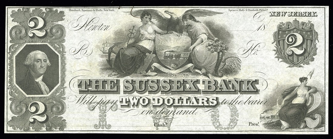 NJ. Newton. Sussex Bank. $2. (G18) Women flank shield. Washington. Choice Unc. Remainder.