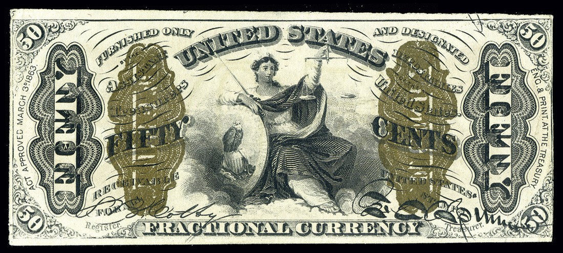 Fr.1343. 50 Cents. Third Issue. Red back. Justice. PMG Almost Uncirculated 55.