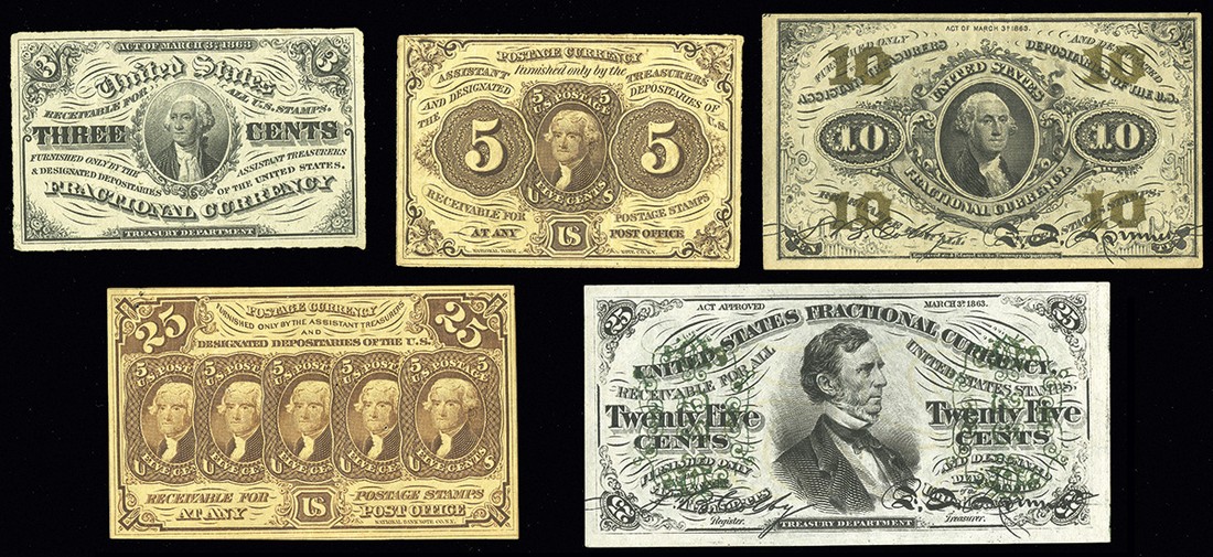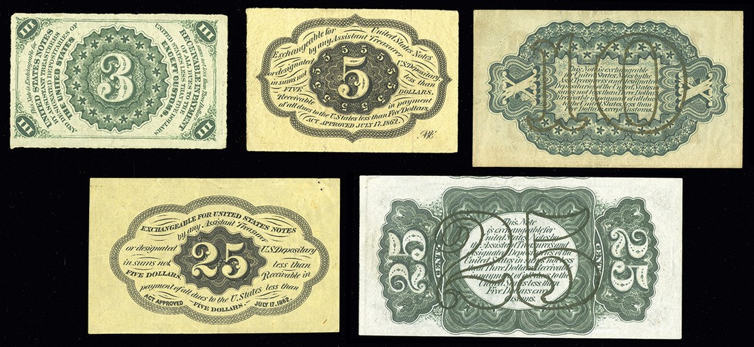 Fractional Currency Assortment. 1) Fr.1226. 3 Cents. Light background. VF-EF. 2) Fr.1230. 5 Cents. Straight. Monogram. VF. 3) Fr.1255. 10 Cents. Washington. Green back. VF. 4) Fr.1282. 25 Cents. Straight. No monogram. VF, pinholes. 5) Fr.1294. 25 Cents. Green back. Uncirculated. [5]