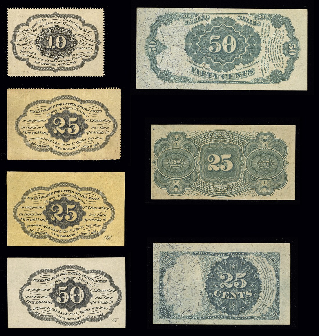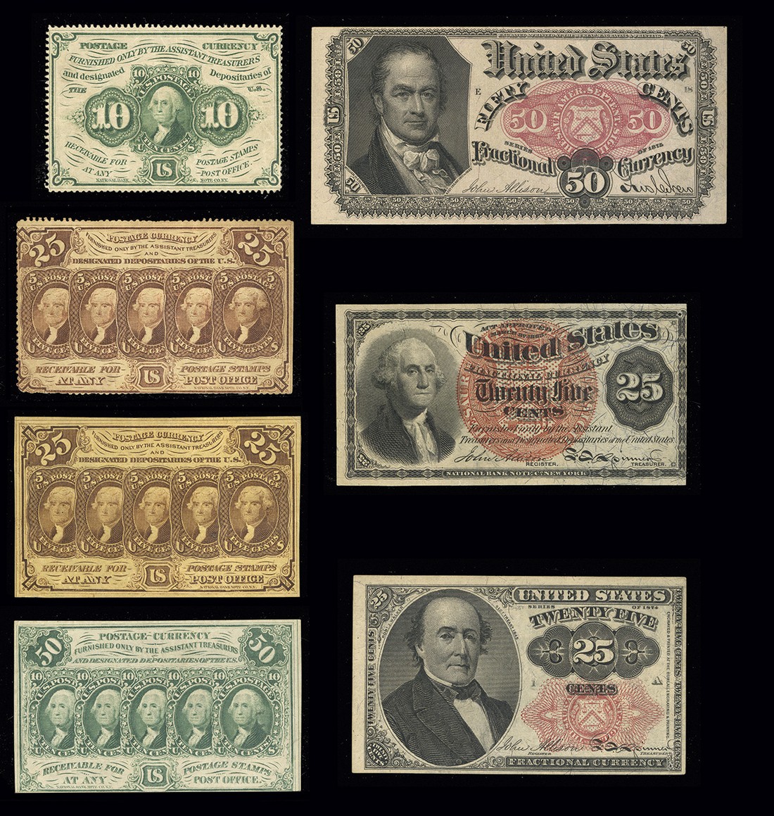Mid-Grade Certified Fractional Currency Selection. First Issue 1) Fr.1241. 10 Cents. Perforated. No mono, PCGS Very Fine 35 PPQ. 2) Fr.1280. 25 Cents. Perforated. No mono. PCGS Very Fine 25. 3) Fr.1281. 25 Cents. Straight. With mono. PCGS Extremely Fine 40 PPQ. 4) Fr.1312. 50 Cents. Straight. With mono. PCGS Choice About New 55 PPQ. Fourth Issue 5) Fr.1307. 25 Cents. Washington. Small red seal. PCGS Extremely Fine 45. Fifth Issue 6) Fr.1308. 25 Cents. Red. Long, thin key. PCGS Choice About New 55. 7) Fr.1381. 50 Cents. Crawford. PCGS Extremely Fine 45 PPQ. [7]