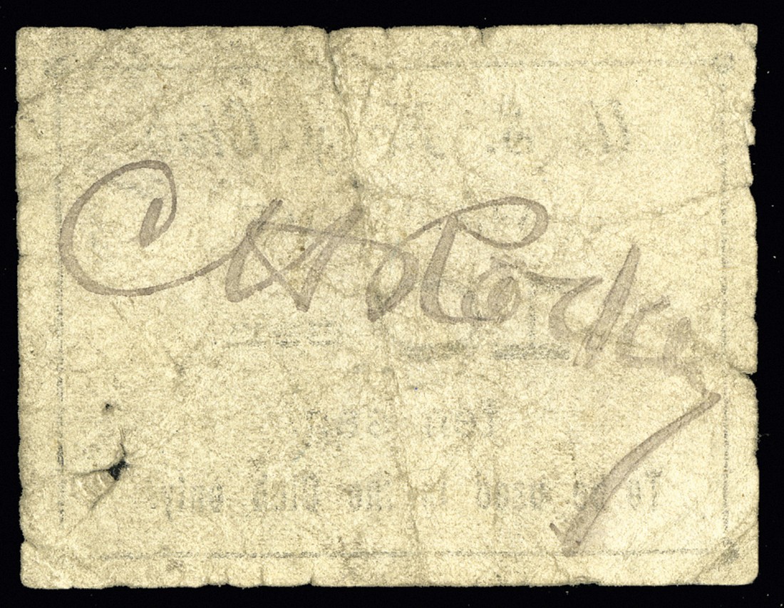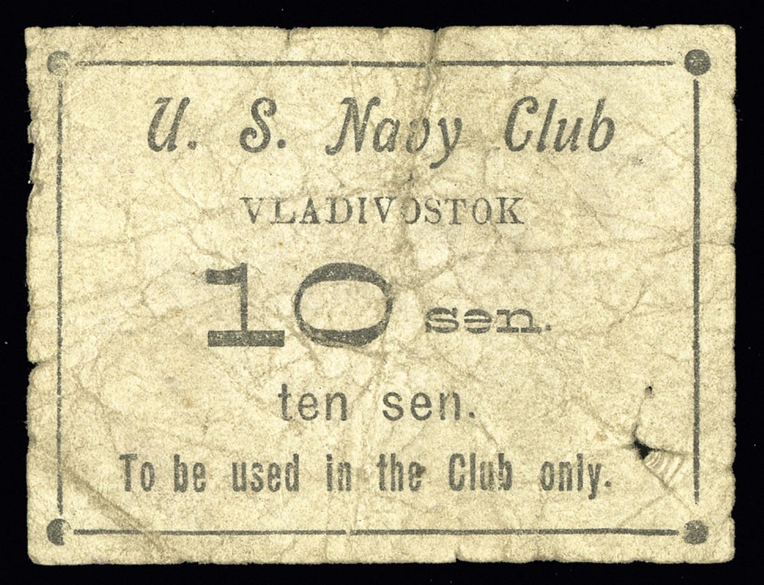 [U.S.-Russia]: U.S. Naval Scrip. U.S. Navy Club. Vladivostok. 10 Sen Circa 1918. Eggshell-white and black ink, 57 x 44mm. Signed on the back by naval officer C.H. Rockey. During World War I, the Allies effectively lost the Eastern Front when the newly formed Russian Soviet Federated Socialist Republic signed the Treaty of Brest-Litovsk ending hostilities with Germany. Having already lost an ally to Communism, the Allied nations now also faced the fear that the stockpiles of supplies sitting in Russian ports could be commandeered by the Germans or Bolsheviks. In response, Great Britain, the United States, France and Japan launched an Anti-Bolshevik expeditionary force in 1918, sending troops to Vladivostok and Arkhangelsk. Of the 13,000 U.S. troops that were sent, 8,000 were garrisoned in Vladivostok, having been shipped out from bases in the Philippines and California. The Allied forces were garrisoned for a year and were then withdrawn. This scrip piece is one of the few mementoes of America's involvement in this little known chapter of history. Very Rare and seldom offered. A similar note in Fine sold for $920 in a 2008 Heritage auction. Fine details, spindle hole, two pinholes and small edge tear.
