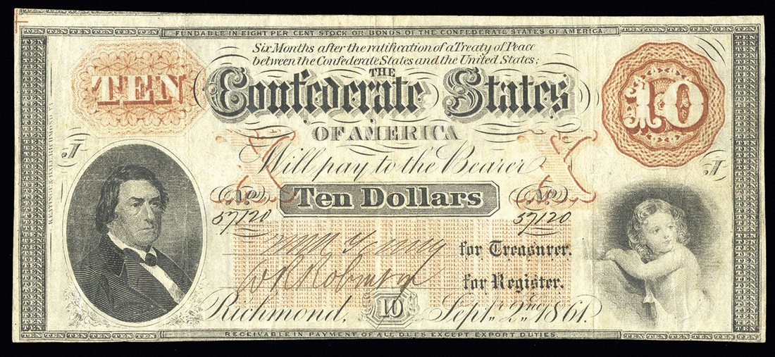 CSA. T-24. $10. 1861. Cr.164 PF-11. Red. R. M. T. Hunter. Keating & Ball, left. CSA script watermark. Fine-VF. A very pleasing example with crisp signatures, vivid original color, and decent margins.
