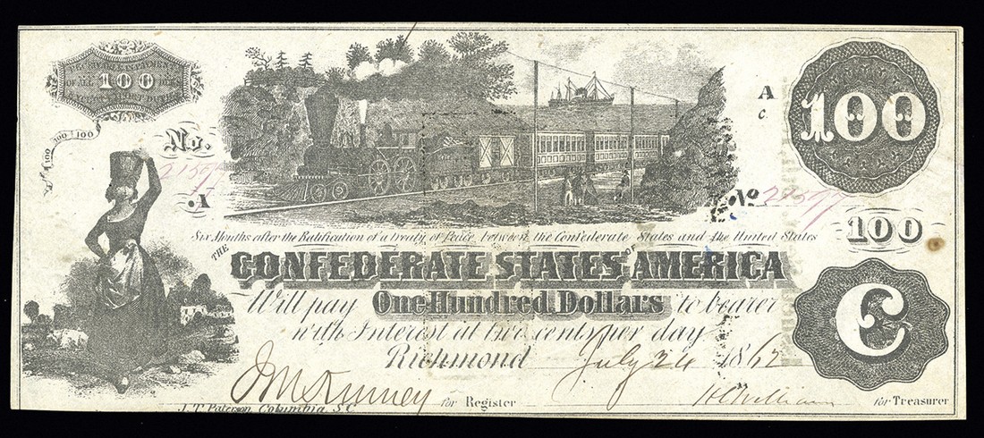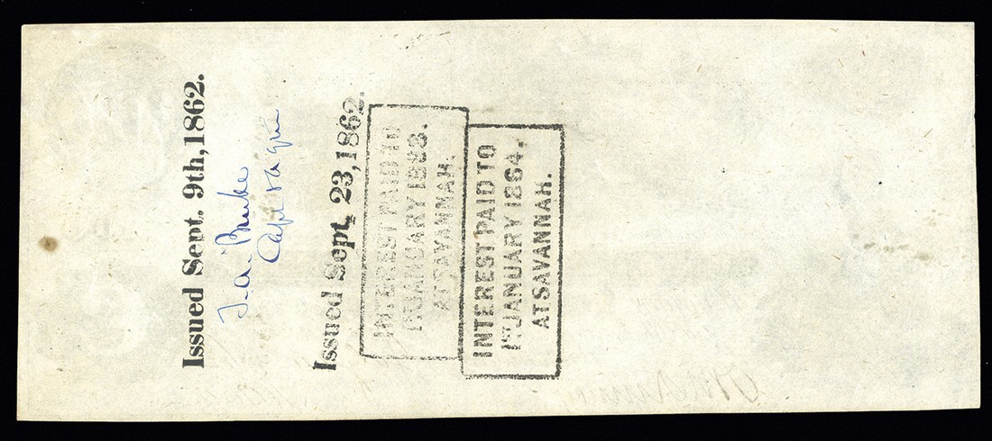 CSA. T-39. $100. July 24, 1862. PF-5. No.21597. Ac. Uncirculated. Minor teller handling, small rust spot and a few pinholes. Black rubber stamp states "Issued Sept. 9th, 1862." "J. A. Burke / Capt & AQM" is handwritten. A second black stamp with "Issued Sept, 23, 1862." Two Savannah interest paid stamps as well.