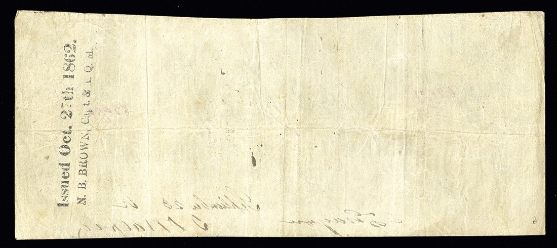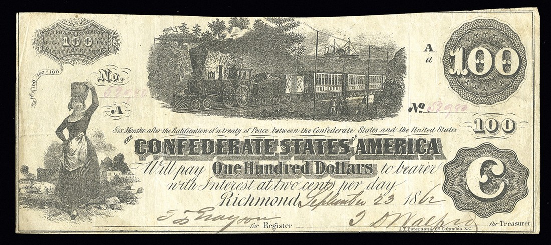 CSA. T-40. $100. Sept. 23, 1862. PF-1. No.52980. Aa. F-FV. Trimmed into the top border. Black stamp with "Issued Oct. 27th 1862. /N. B. BROWN, Capt. & A. Q. M."